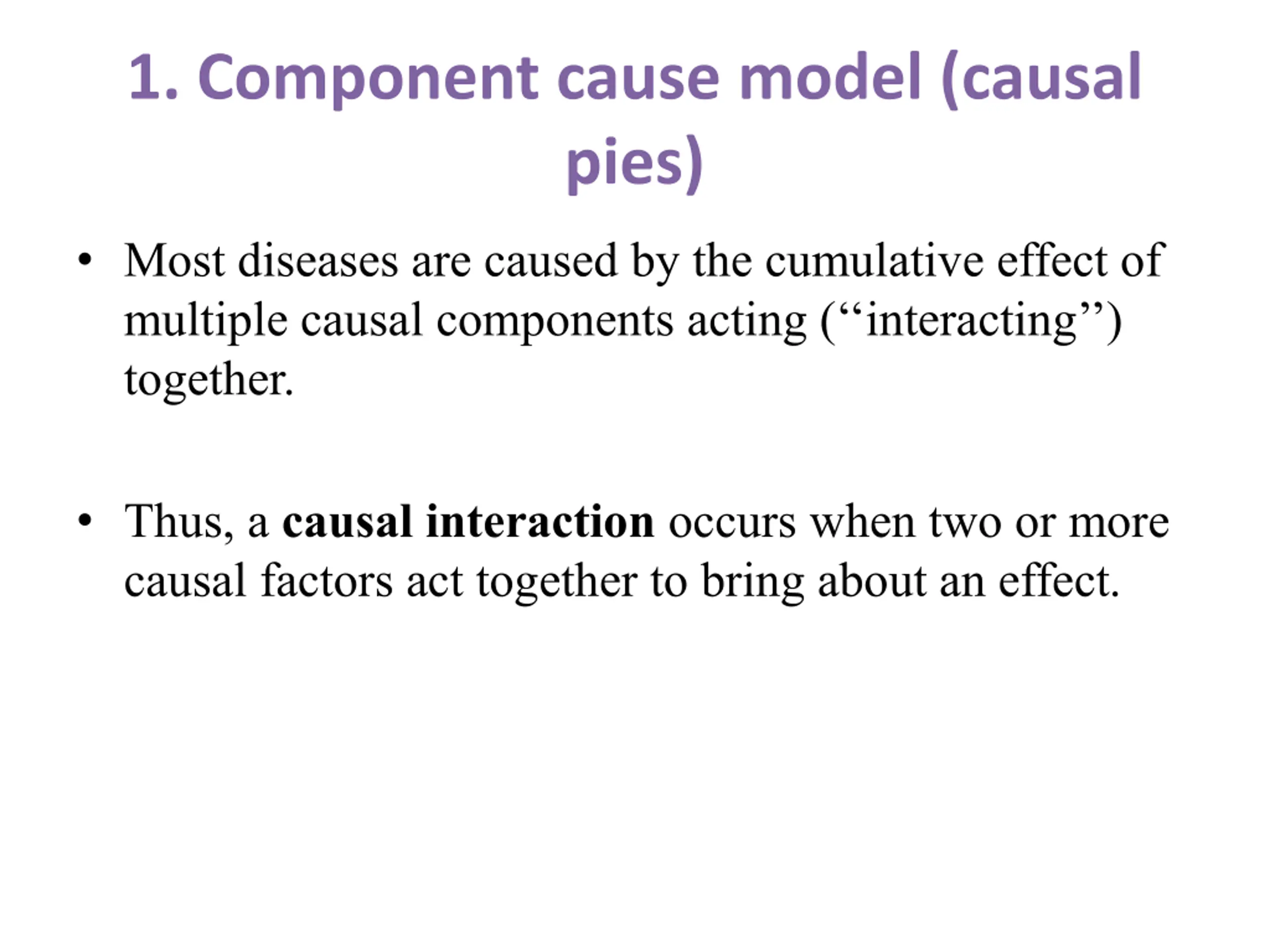 1. Component cause model (causal pies) Most diseases are caused by the cumulative effect of multiple causal components acting ( interacting ) together. Thus, a causal interaction occurs when two or more causal factors act together to bring about an effect.