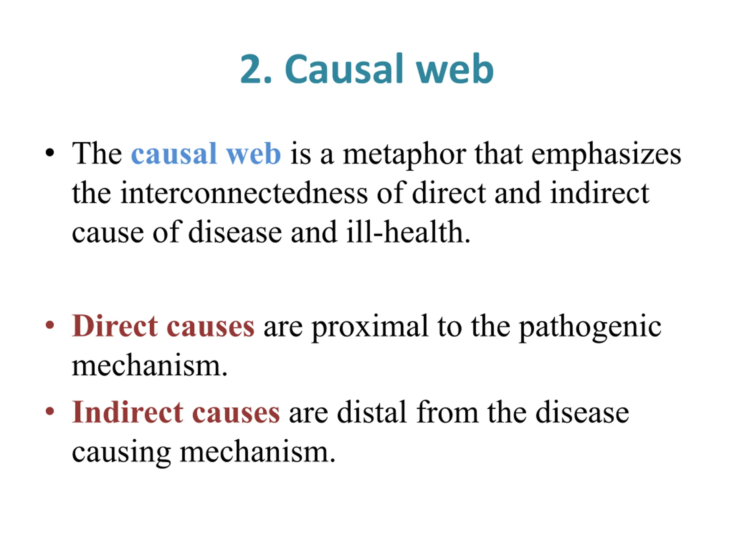 2. Causal web The causal web is a metaphor that emphasizes the interconnectedness of direct and indirect cause of disease and ill-health. Direct causes are proximal to the pathogenic mechanism. Indirect causes are distal from the disease causing mechanism.