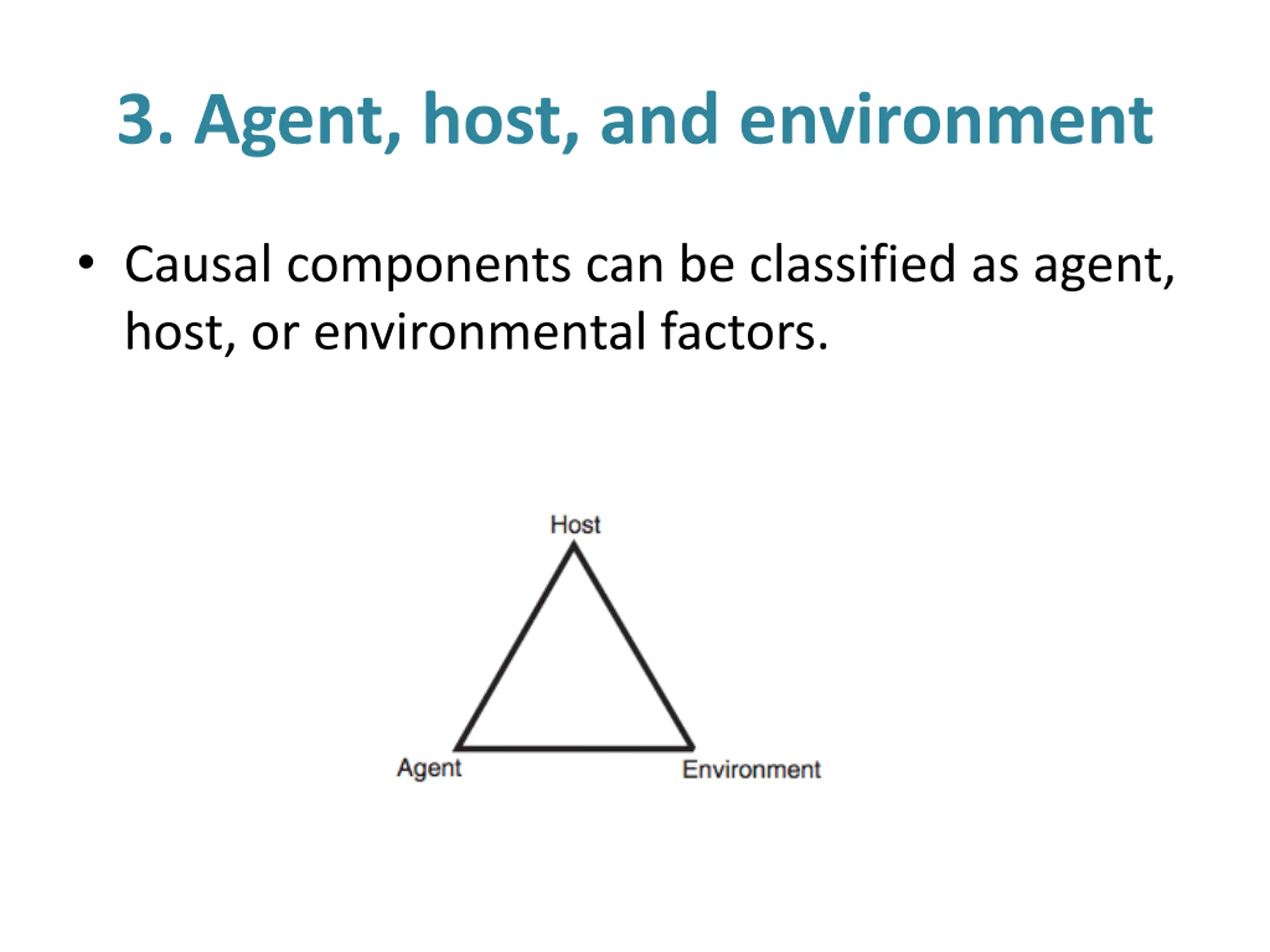 3. Agent, host, and environment Causal components can be classified as agent, host, or environmental factors.