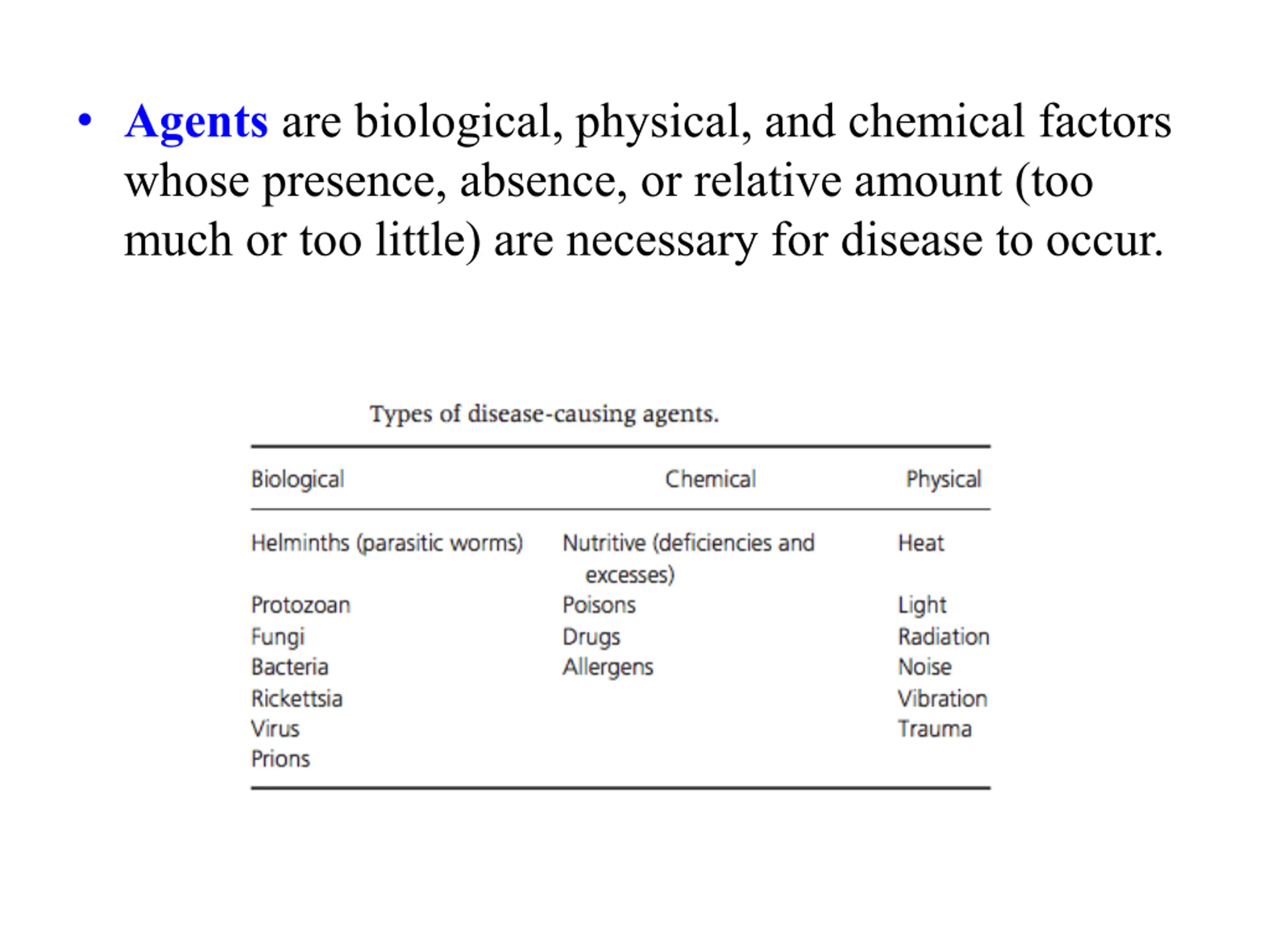 Agents are biological, physical, and chemical factors whose presence, absence, or relative amount (too much or too little) are necessary for disease to occur.