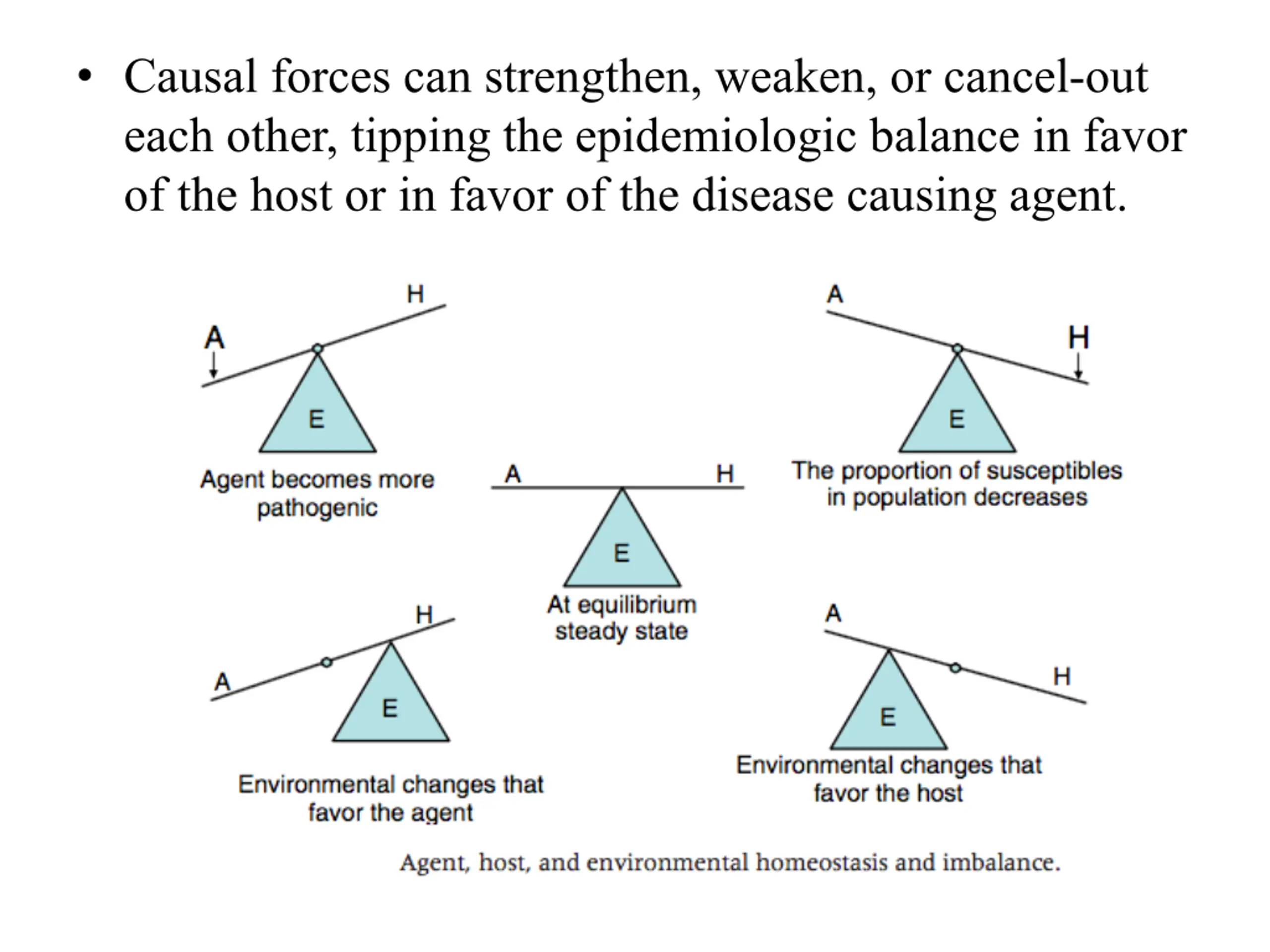 Causal forces can strengthen, weaken, or cancel-out each other, tipping the epidemiologic balance in favor of the host or in favor of the disease causing agent.