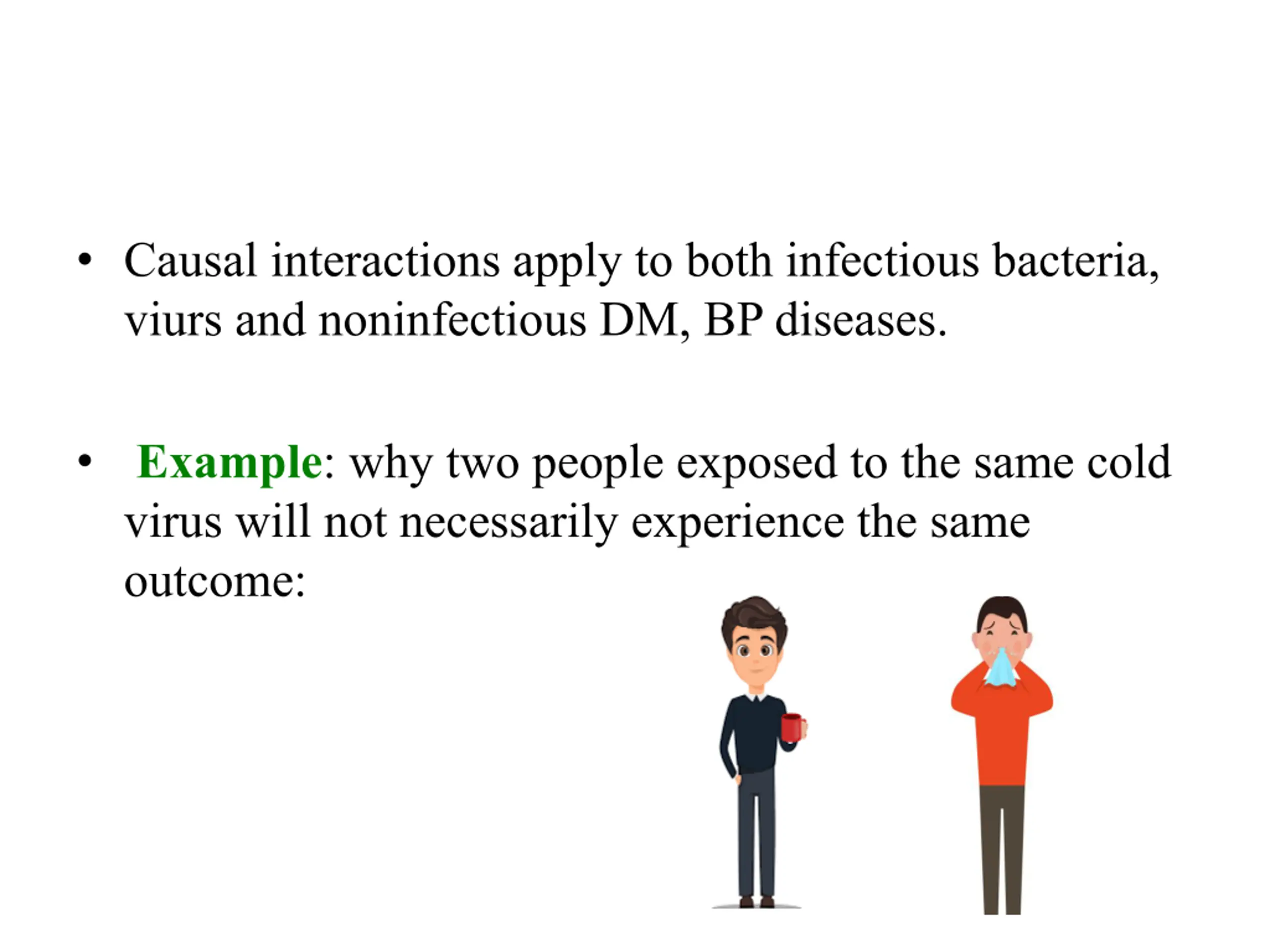 Causal interactions apply to both infectious bacteria, viurs and noninfectious DM, BP diseases. Example: why two people exposed to the same cold virus will not necessarily experience the same outcome: