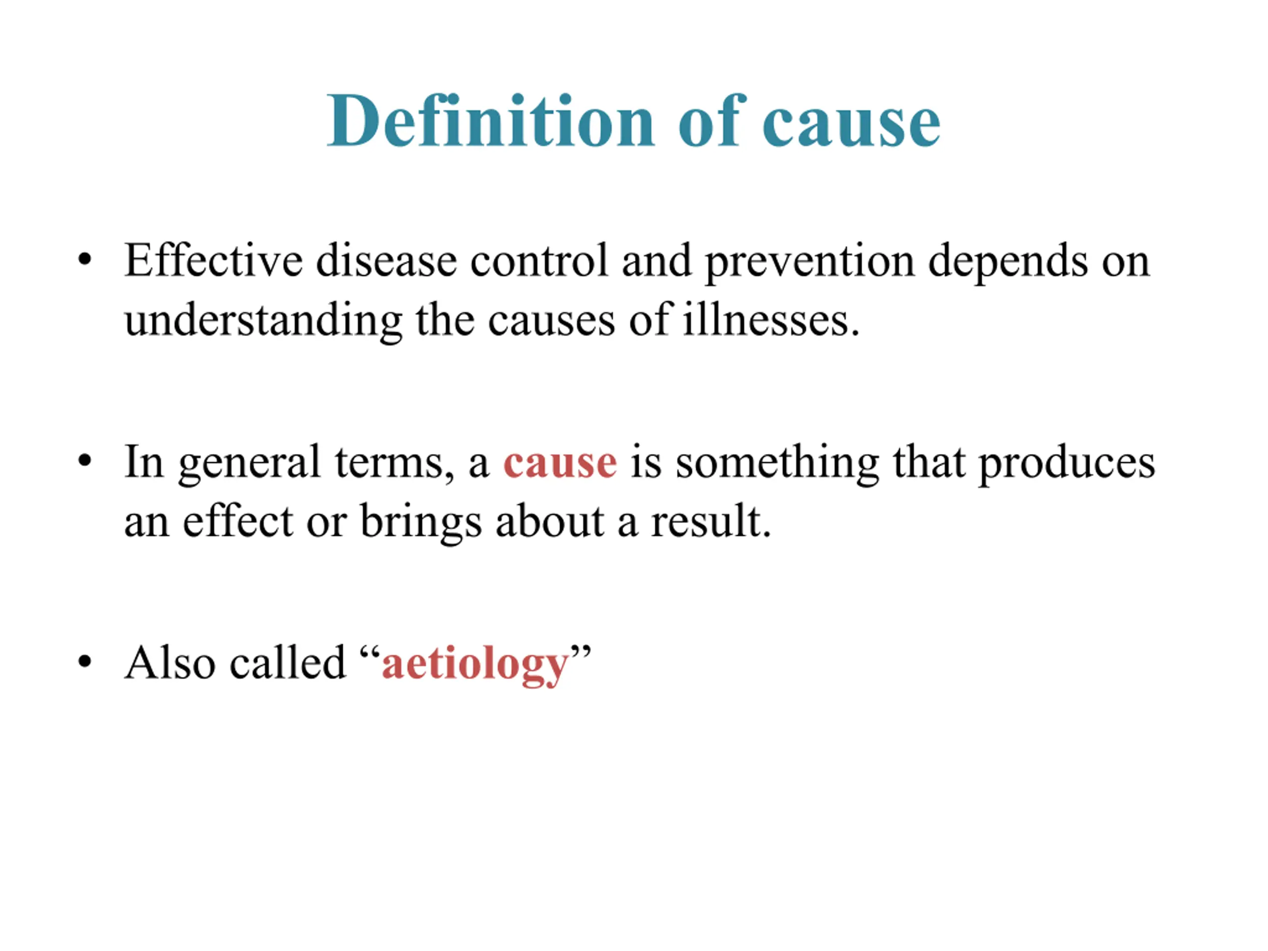 Definition of cause Effective disease control and prevention depends on understanding the causes of illnesses. In general terms, a cause is something that produces an effect or brings about a result. Also called aetiology