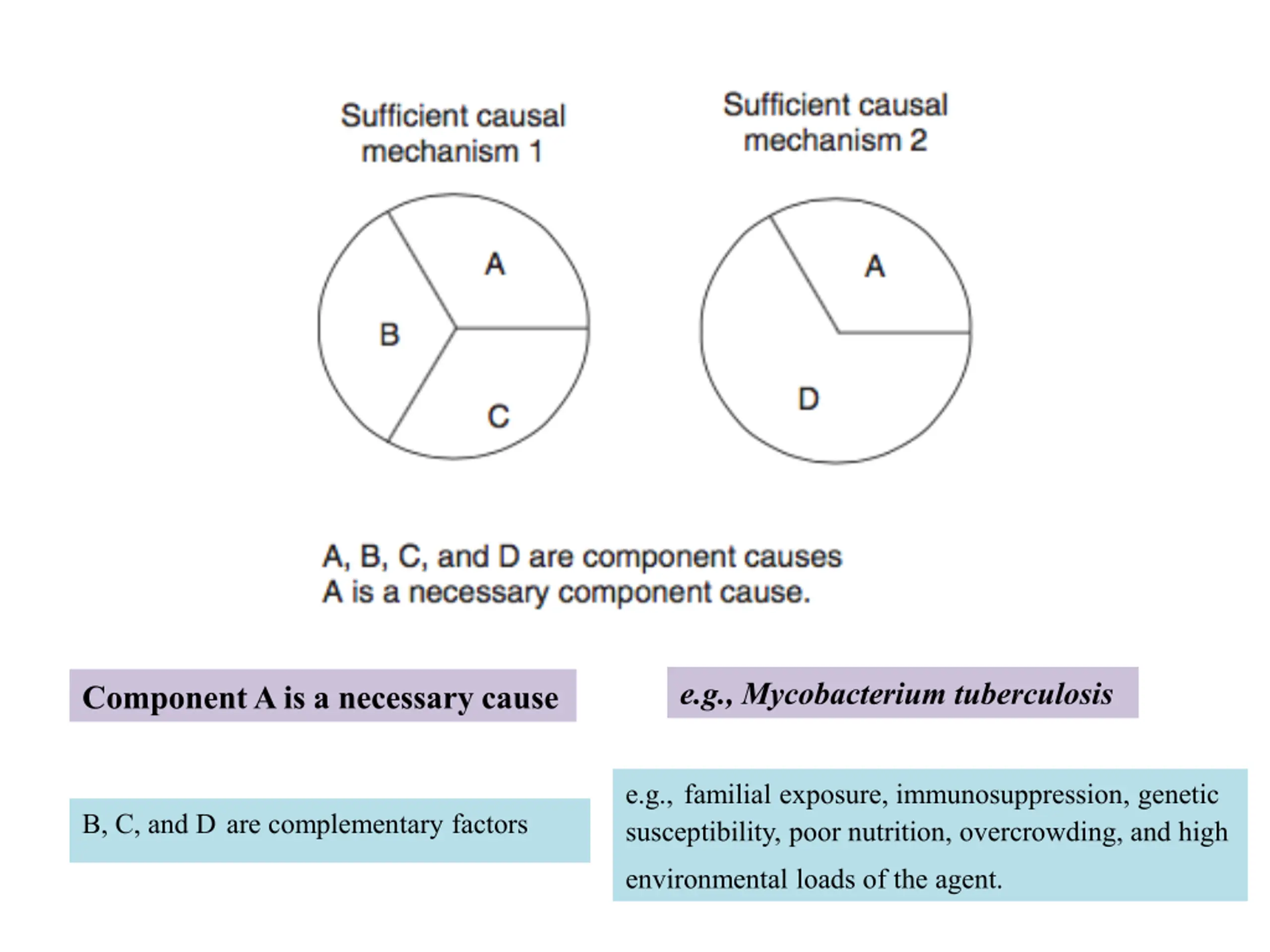 e.g., Mycobacterium tuberculosis Component A is a necessary cause e.g.,familial exposure, immunosuppression, genetic susceptibility, poor nutrition, overcrowding, and high B, C, and Dare complementary factors environmental loads of the agent.
