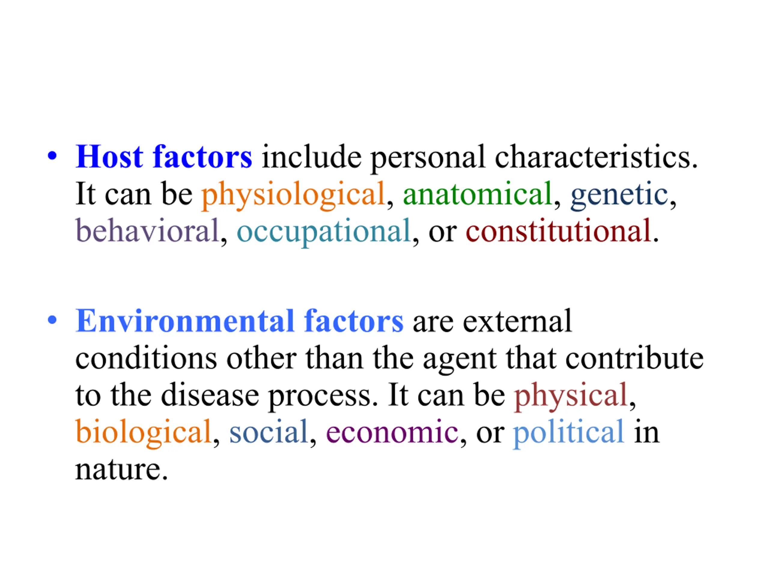 Host factors include personal characteristics. It can be physiological, anatomical, genetic, behavioral, occupational, or constitutional. Environmental factors are external conditions other than the agent that contribute to the disease process. It can be physical, biological, social, economic, or political in nature.
