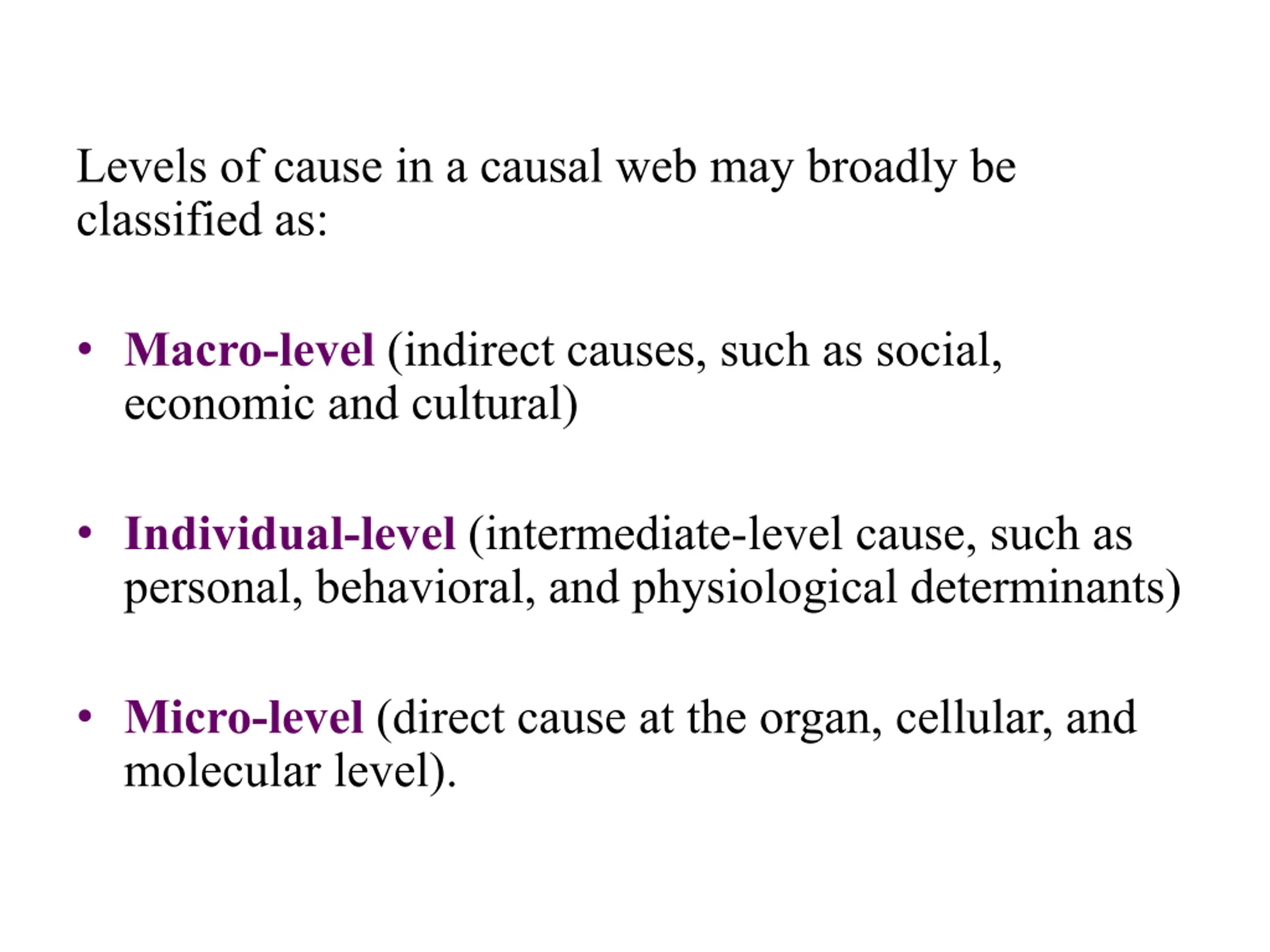 Levels of cause in a causal web may broadly be classified as: Macro-level (indirect causes, such as social, economic and cultural) Individual-level (intermediate-level cause, such as personal, behavioral, and physiological determinants) Micro-level (direct cause at the organ, cellular, and molecular level).