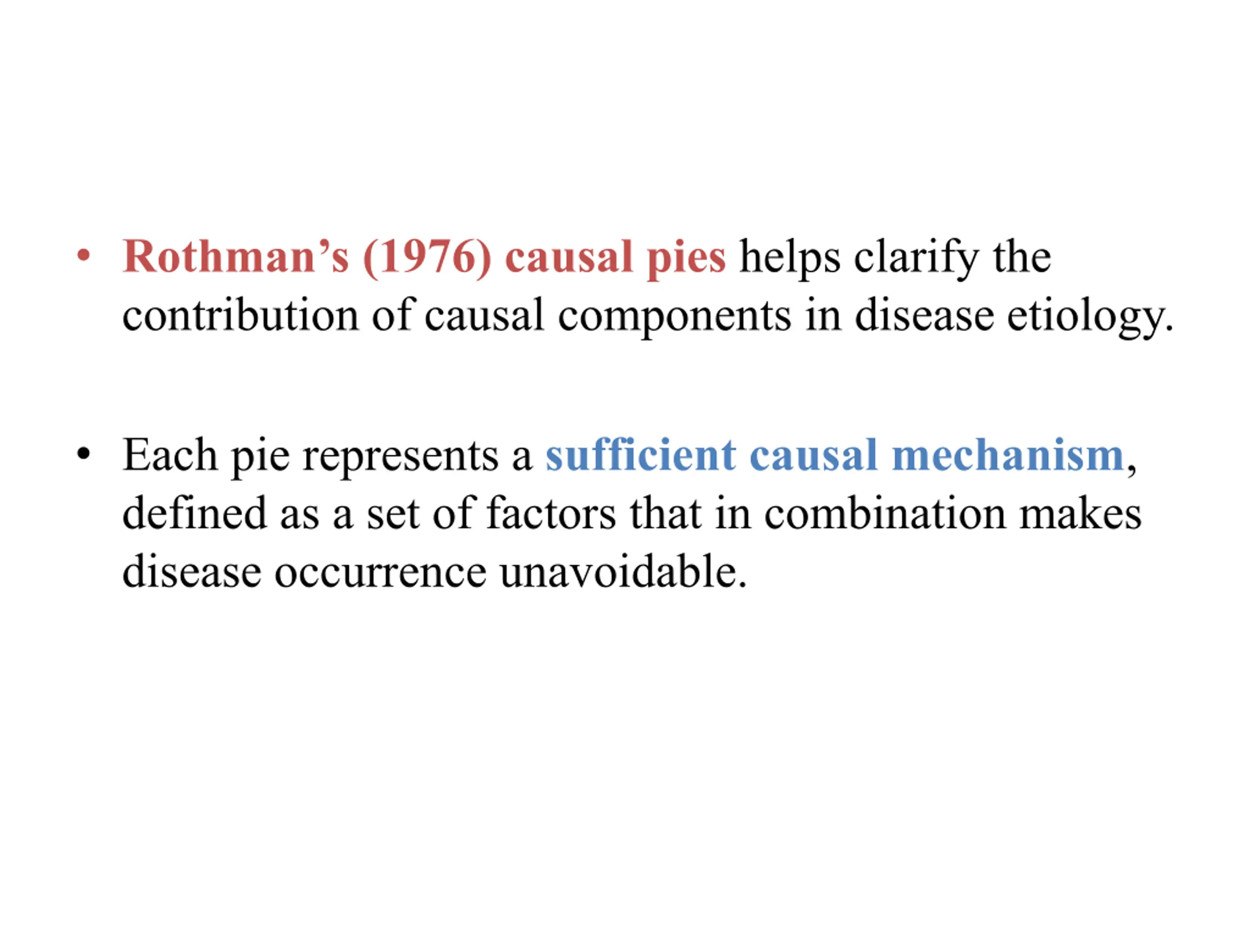 Rothmans (1976) causal pies helps clarify the contribution of causal components in disease etiology. Each pie represents a sufficient causal mechanism, defined as a set of factors that in combination makes disease occurrence unavoidable.