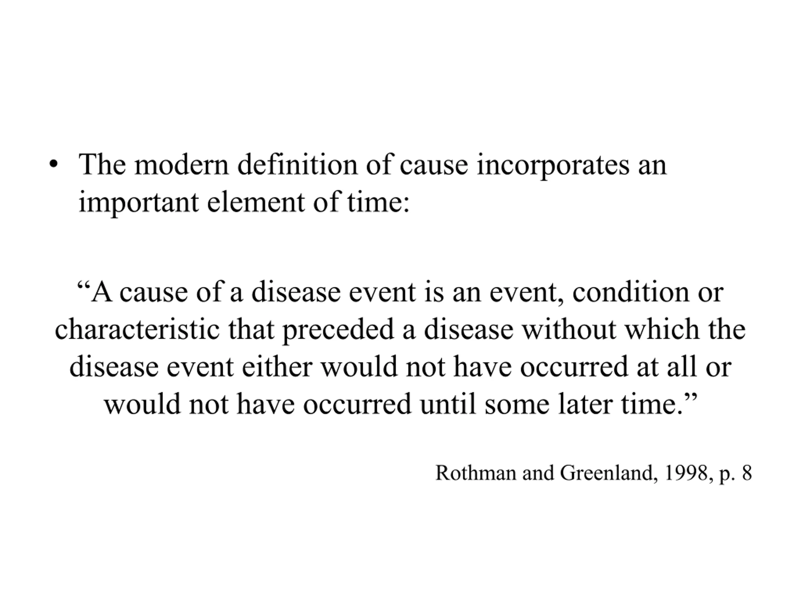 The modern definition of cause incorporates an important element of time: A cause of a disease event is an event, condition or characteristic that preceded a disease without which the disease event either would not have occurred at all or would not have occurred until some later time. Rothman and Greenland, 1998, p. 8