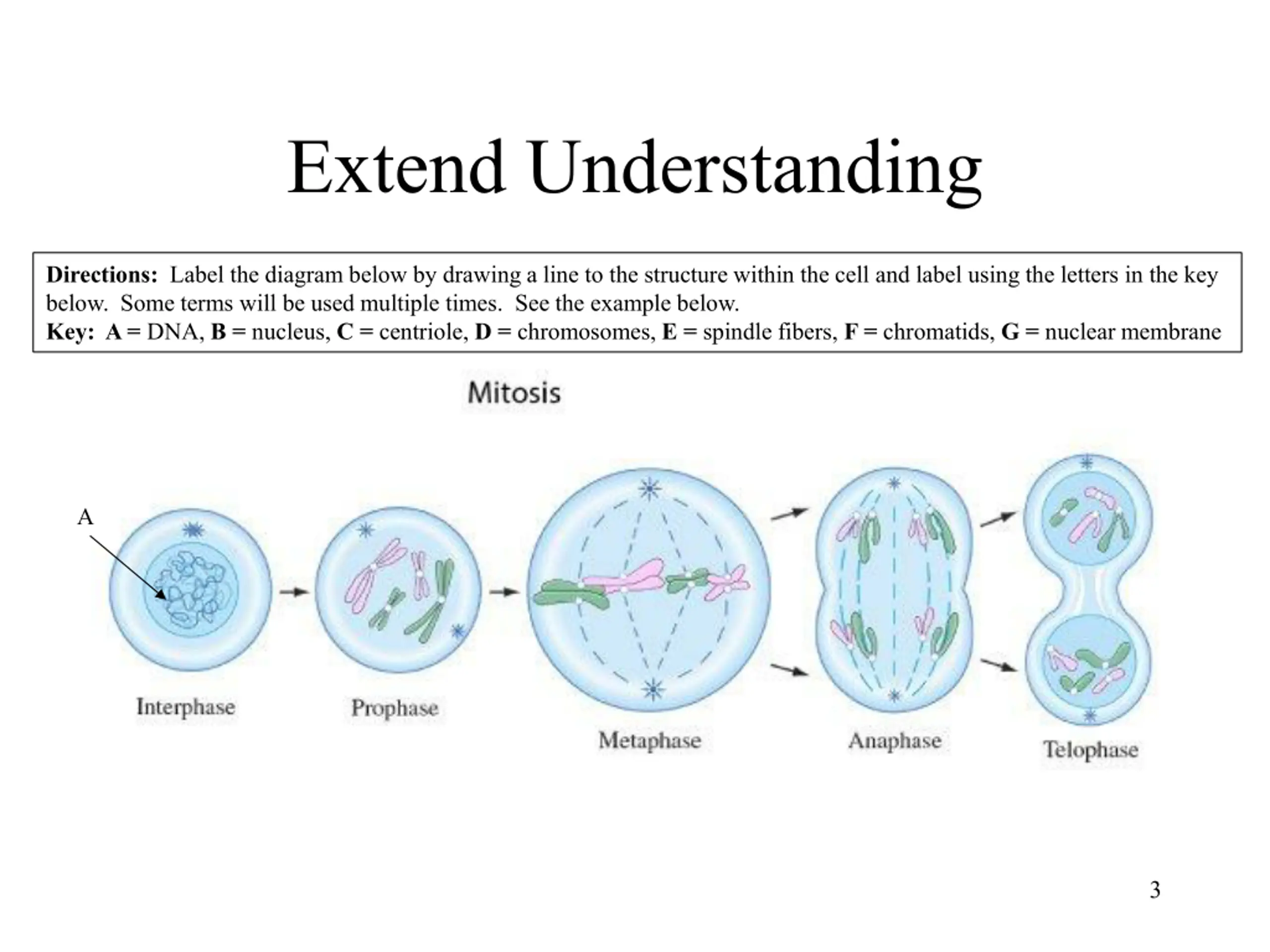Extend Understanding Directions: Label the diagram below by drawing a line to the structure within the cell and label using the letters in the key below. Some terms will be used multiple times. See the example below. Key: A = DNA, B = nucleus, C = centriole, D = chromosomes, E = spindle fibers, F = chromatids, G = nuclear membrane A 3