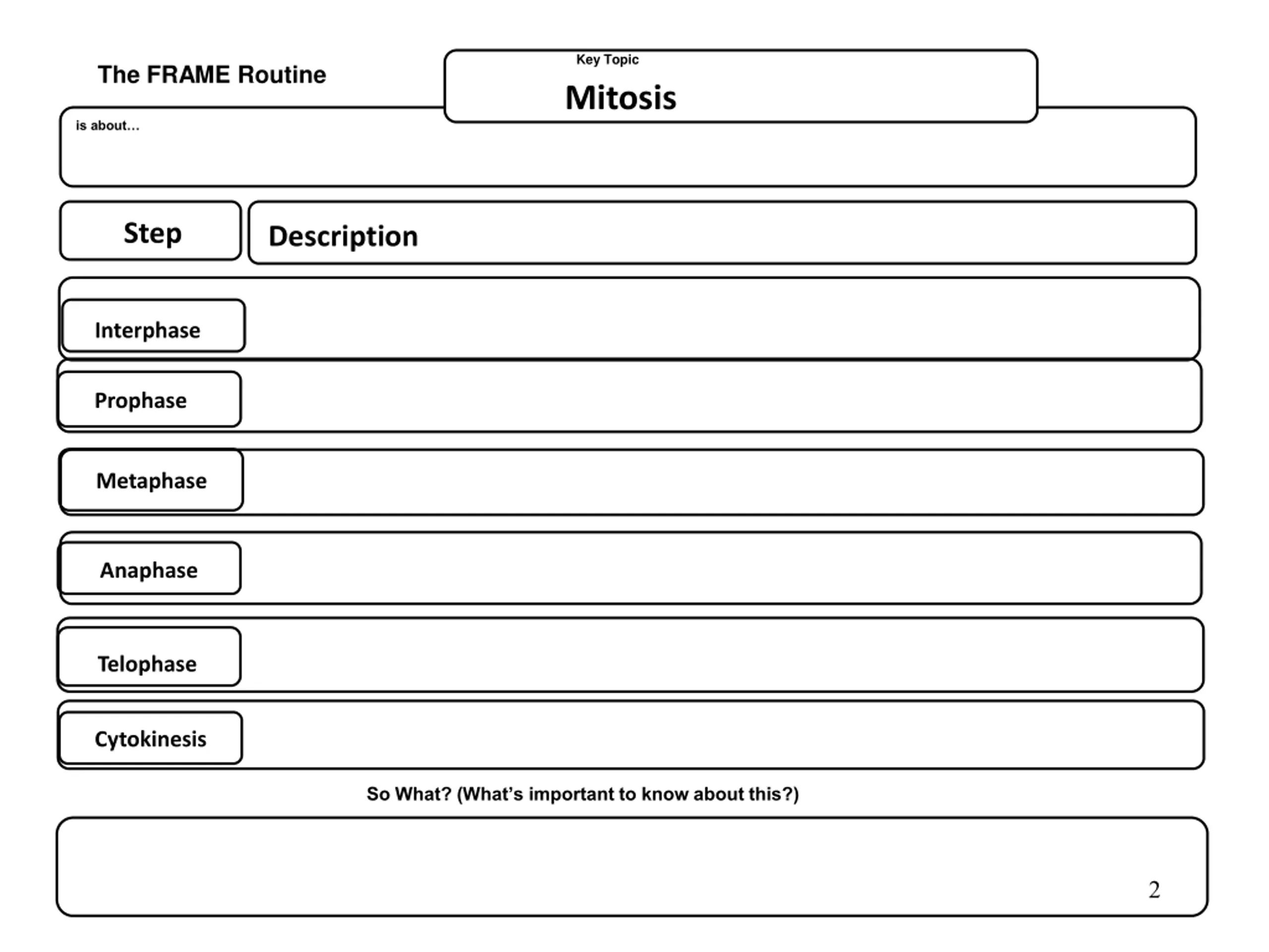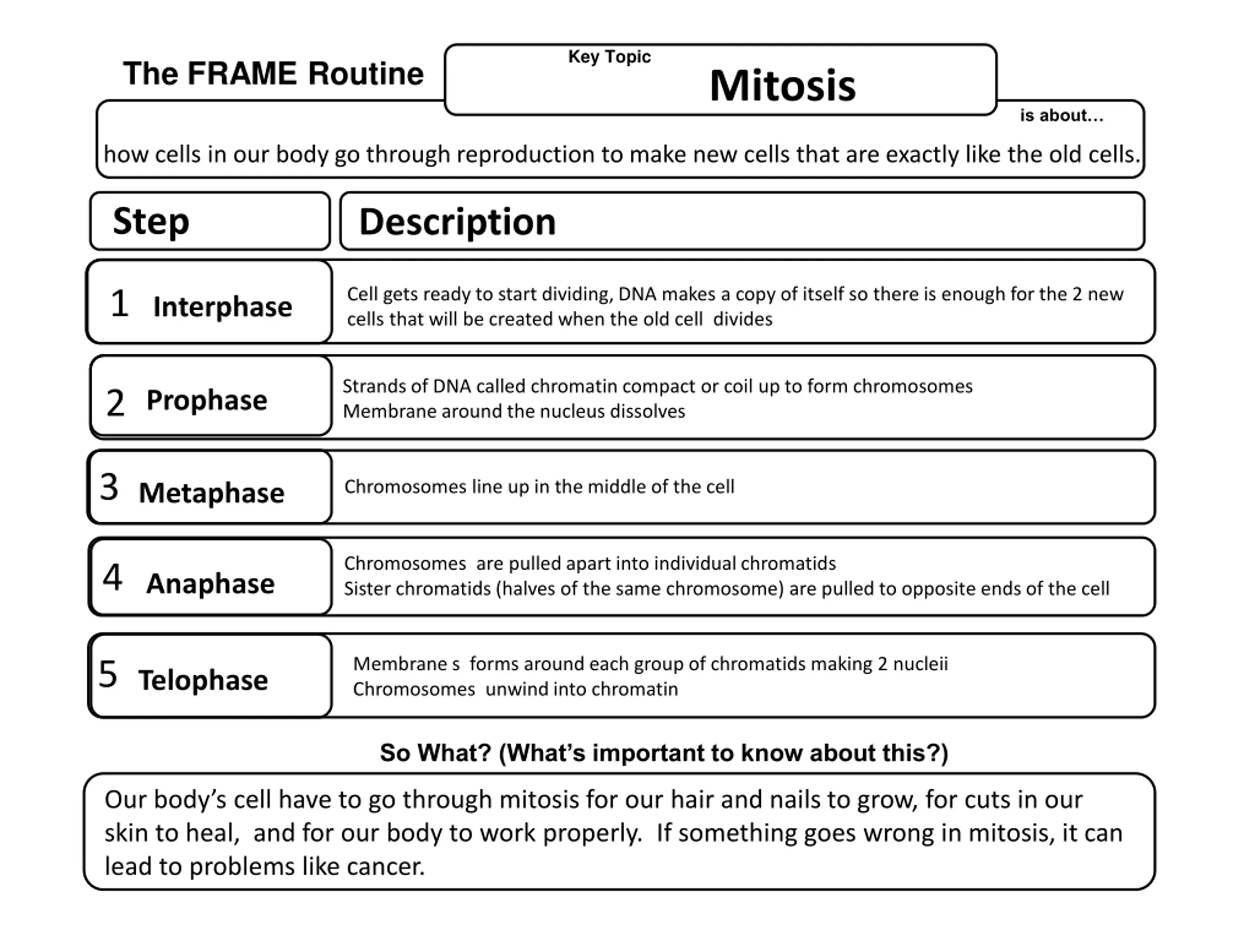 Key Topic Mitosis The FRAME Routine is about Step Description Interphase Prophase Metaphase Anaphase Telophase Cytokinesis So What? (What s important to know about this?) 2