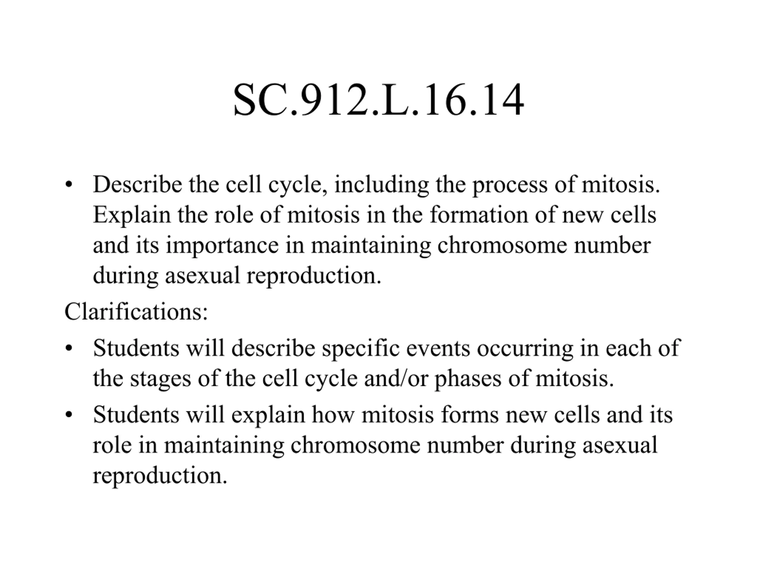 SC.912.L.16.14 Describe the cell cycle, including the process of mitosis. Explain the role of mitosis in the formation of new cells and its importance in maintaining chromosome number during asexual reproduction. Clarifications: Students will describe specific events occurring in each of the stages of the cell cycle and/or phases of mitosis. Students will explain how mitosis forms new cells and its role in maintaining chromosome number during asexual reproduction.