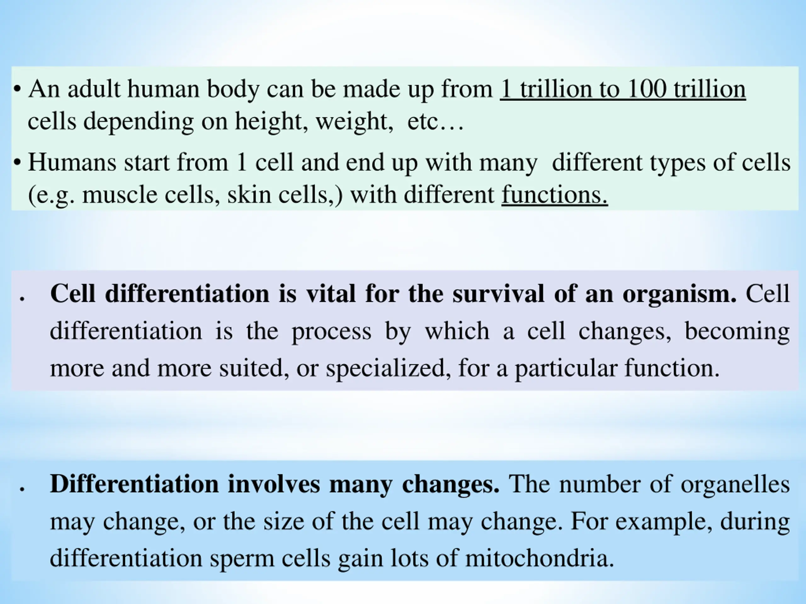 An adult human body can be made up from 1 trillion to 100 trillion cells depending on height, weight, etc Humans start from 1 cell and end up with many different types of cells (e.g. muscle cells, skin cells,) with different functions. Cell differentiation is vital for the survival of an organism. Cell differentiation is the process by which a cell changes, becoming more and more suited, or specialized, for a particular function. Differentiation involves many changes. The number of organelles may change, or the size of the cell may change. For example, during differentiation sperm cells gain lots of mitochondria.
