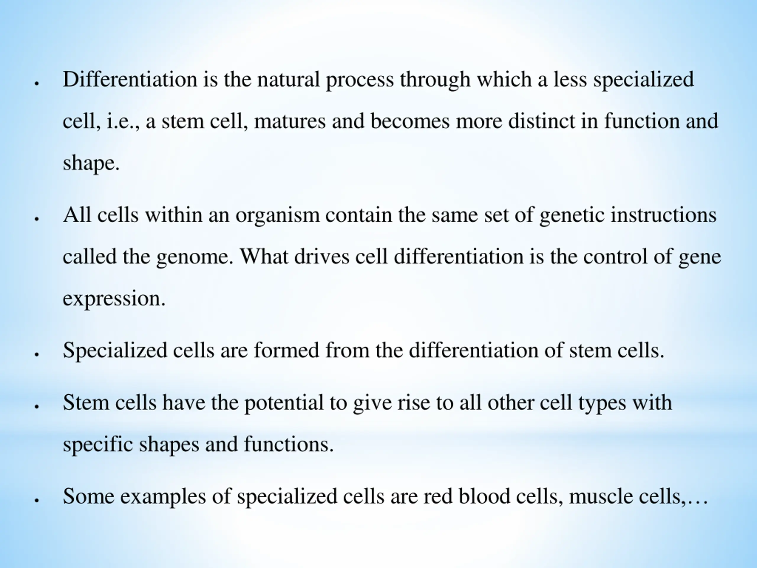 Differentiation is the natural process through which a less specialized cell, i.e., a stem cell, matures and becomes more distinct in function and shape. All cells within an organism contain the same set of genetic instructions called the genome. What drives cell differentiation is the control of gene expression. Specialized cells are formed from the differentiation of stem cells. Stem cells have the potential to give rise to all other cell types with specific shapes and functions. Some examples of specialized cells are red blood cells, muscle cells,