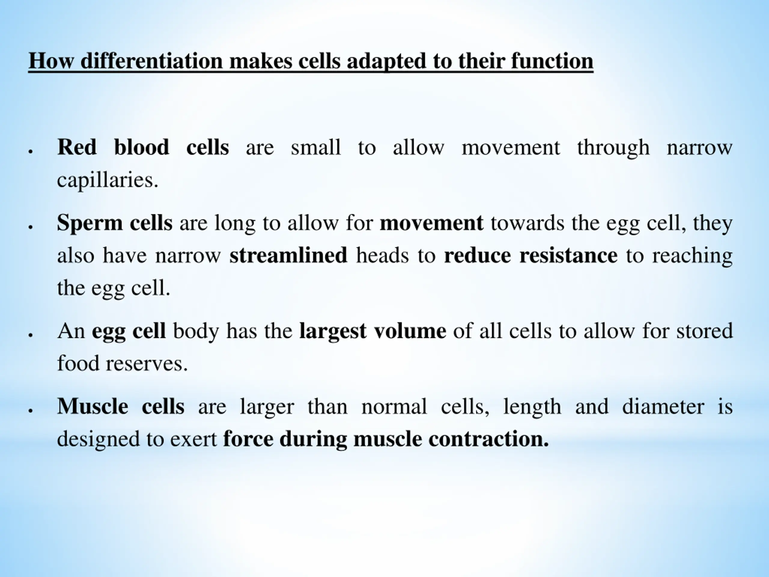 How differentiation makes cells adapted to their function Red blood cells are small to allow movement through narrow capillaries. Sperm cells are long to allow for movement towards the egg cell, they also have narrow streamlined heads to reduce resistance to reaching the egg cell. An egg cell body has the largest volume of all cells to allow for stored food reserves. Muscle cells are larger than normal cells, length and diameter is designed to exert force during muscle contraction.