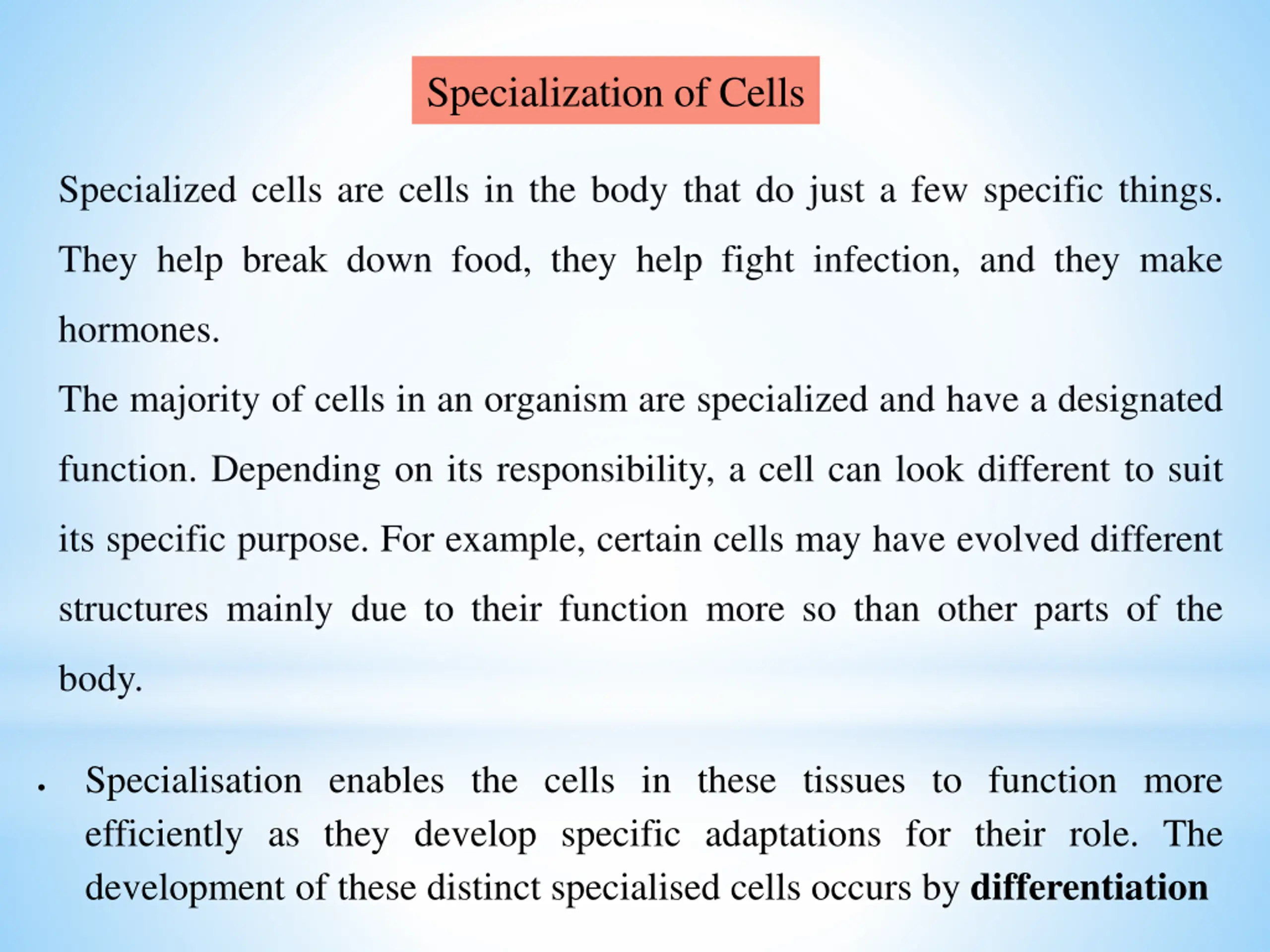 Specialization of Cells Specialized cells are cells in the body that do just a few specific things. They help break down food, they help fight infection, and they make hormones. The majority of cells in an organism are specialized and have a designated function. Depending on its responsibility, a cell can look different to suit its specific purpose. For example, certain cells may have evolved different structures mainly due to their function more so than other parts of the body. Specialisation enables the cells in these tissues to function more efficiently as they develop specific adaptations for their role. The development of these distinct specialised cells occurs by differentiation