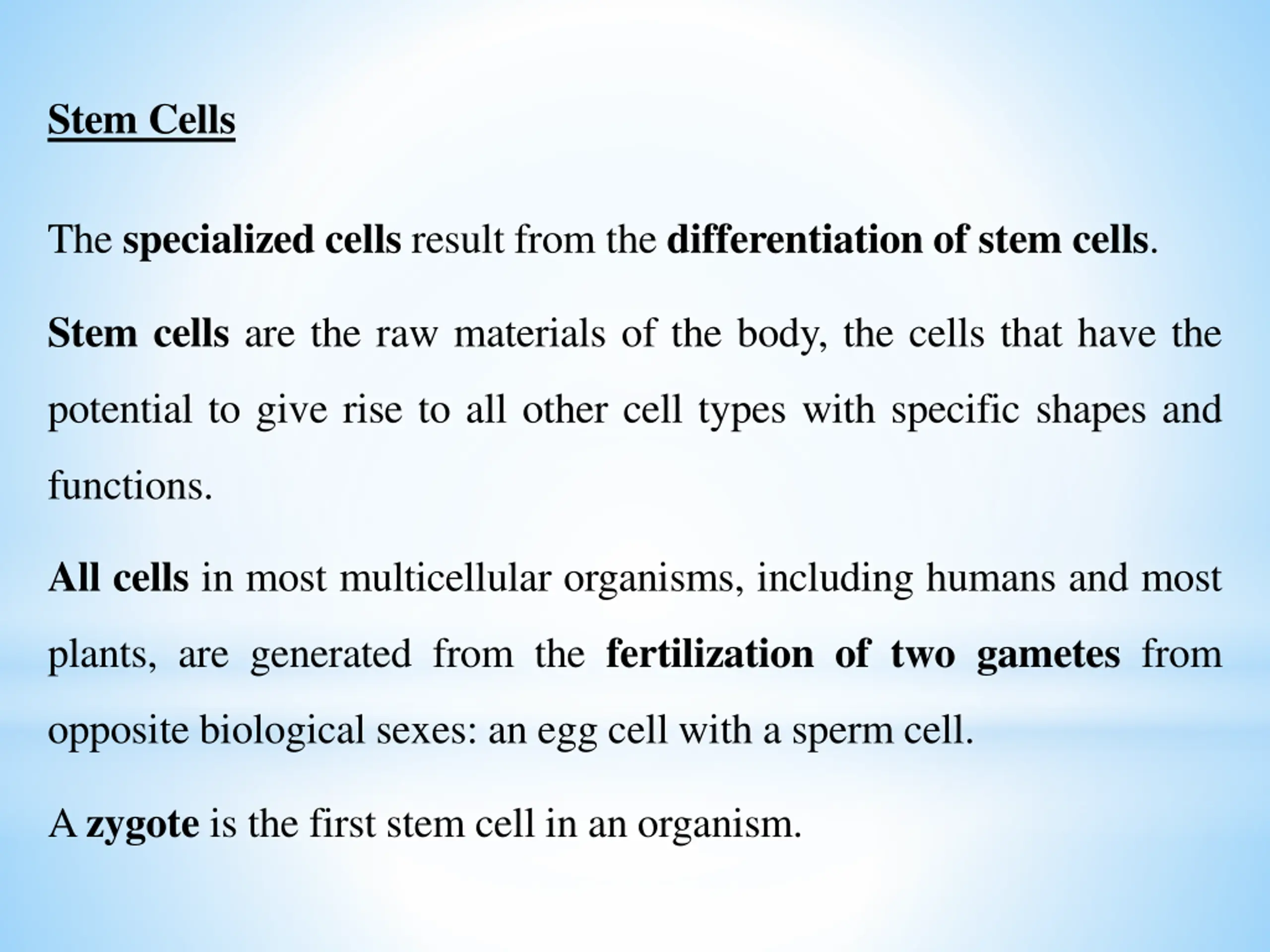 Stem Cells The specialized cells result from the differentiation of stem cells. Stem cells are the raw materials of the body, the cells that have the potential to give rise to all other cell types with specific shapes and functions. All cells in most multicellular organisms, including humans and most plants, are generated from the fertilization of two gametes from opposite biological sexes: an egg cell with a sperm cell. Azygote is the first stem cell in an organism.