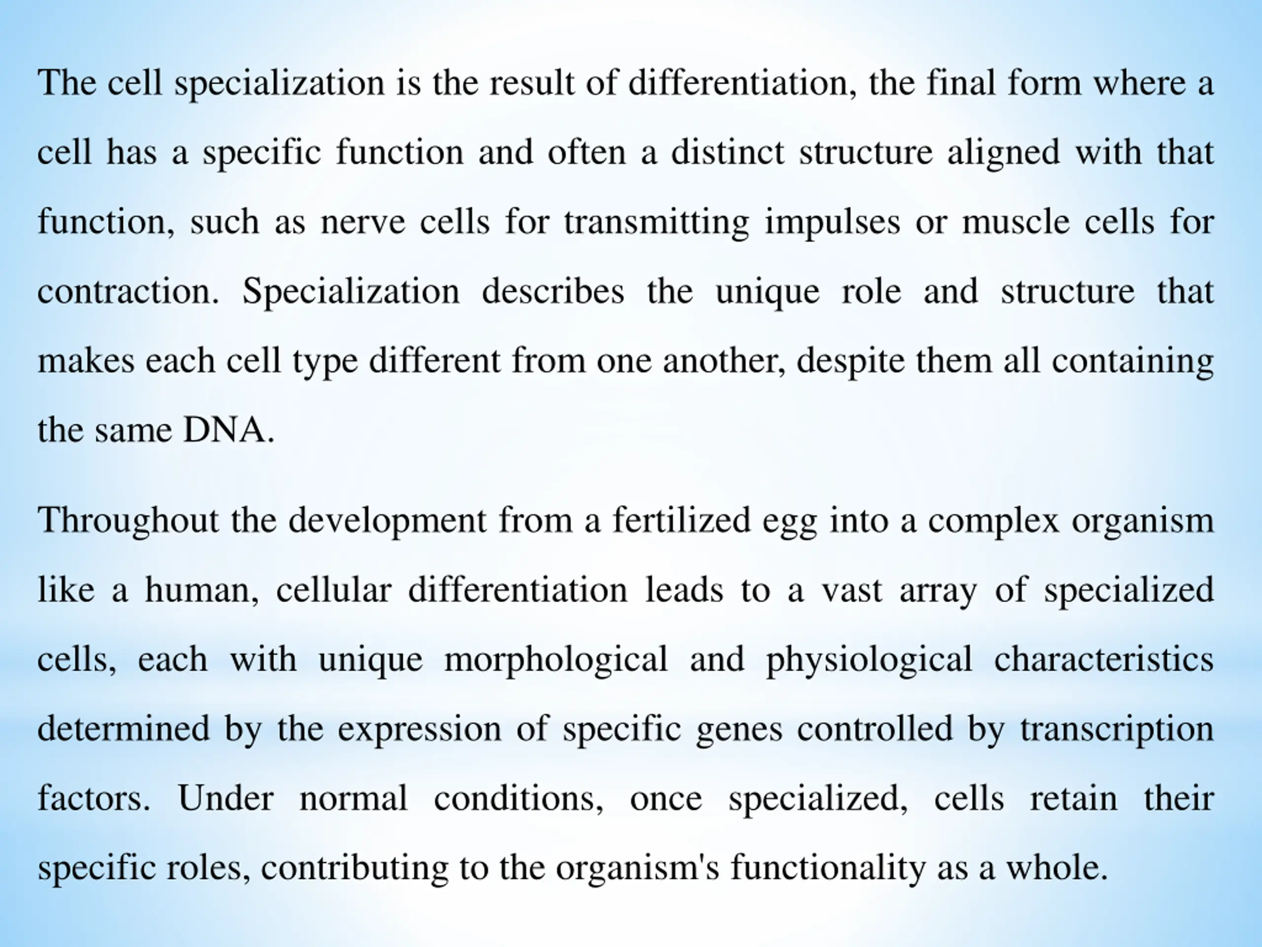 The cell specialization is the result of differentiation, the final form where a cell has a specific function and often a distinct structure aligned with that function, such as nerve cells for transmitting impulses or muscle cells for contraction. Specialization describes the unique role and structure that makes each cell type different from one another, despite them all containing the same DNA. Throughout the development from a fertilized egg into a complex organism like a human, cellular differentiation leads to a vast array of specialized cells, each with unique morphological and physiological characteristics determined by the expression of specific genes controlled by transcription factors. Under normal conditions, once specialized, cells retain their specific roles, contributing to the organism's functionality as a whole.