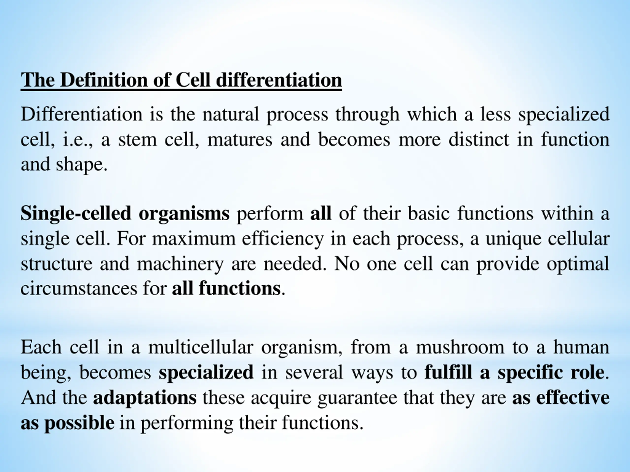 The Definition of Cell differentiation Differentiation is the natural process through which a less specialized cell, i.e., a stem cell, matures and becomes more distinct in function and shape. Single-celled organisms perform all of their basic functions within a single cell. For maximum efficiency in each process, a unique cellular structure and machinery are needed. No one cell can provide optimal circumstances for all functions. Each cell in a multicellular organism, from a mushroom to a human being, becomes specialized in several ways to fulfill a specific role. And the adaptations these acquire guarantee that they are as effective as possible in performing their functions.