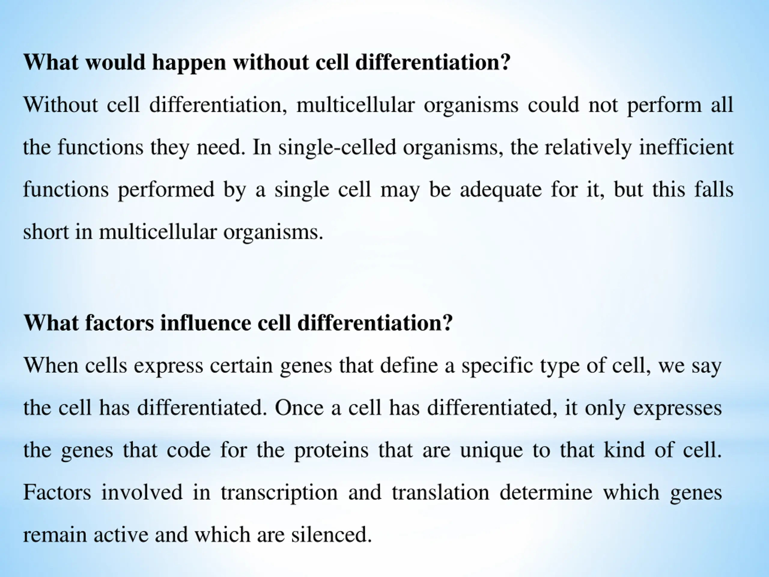 What would happen without cell differentiation? Without cell differentiation, multicellular organisms could not perform all the functions they need. In single-celled organisms, the relatively inefficient functions performed by a single cell may be adequate for it, but this falls short in multicellular organisms. What factors influence cell differentiation? When cells express certain genes that define a specific type of cell, we say the cell has differentiated. Once a cell has differentiated, it only expresses the genes that code for the proteins that are unique to that kind of cell. Factors involved in transcription and translation determine which genes remain active and which are silenced.