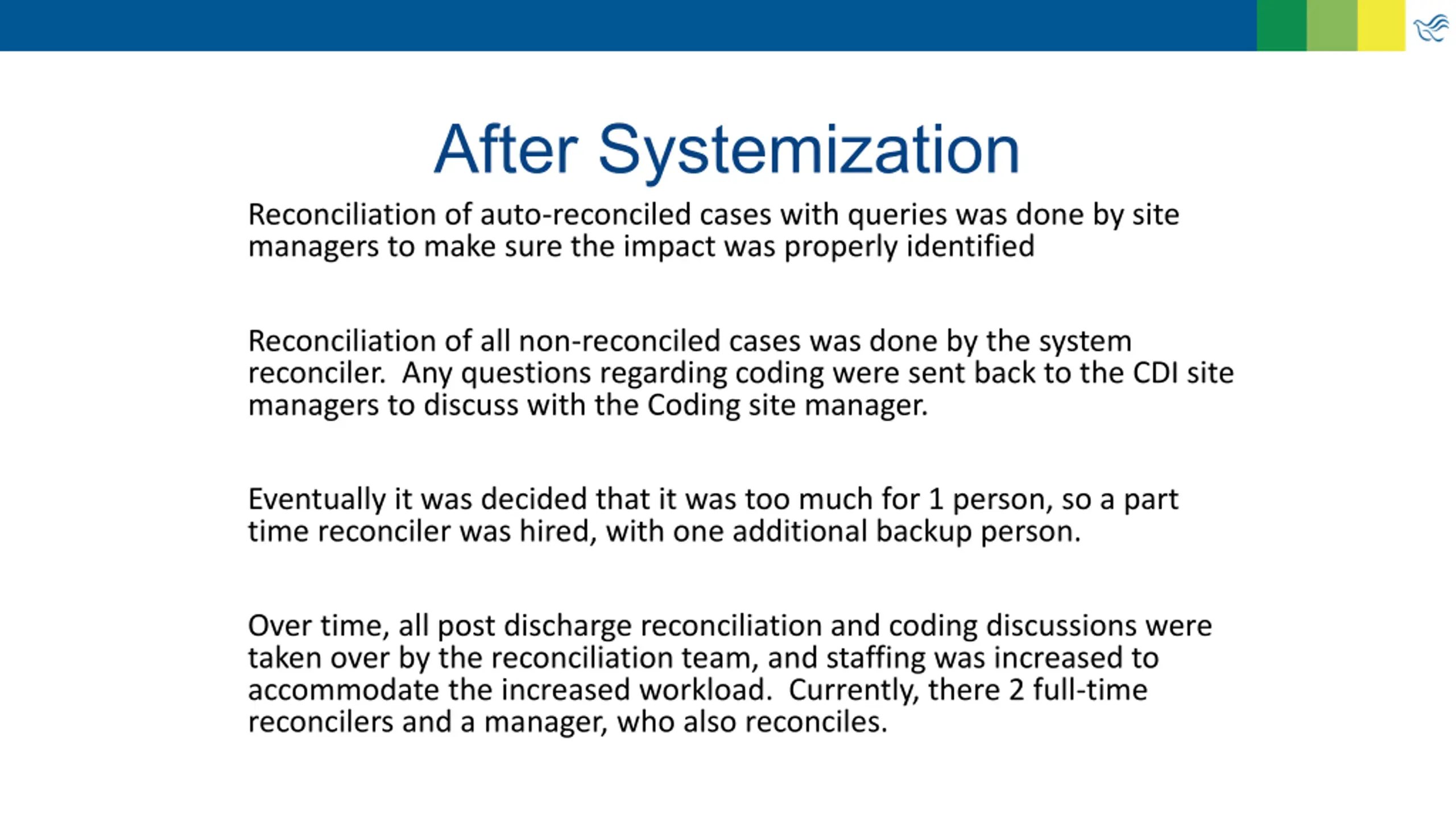 After Systemization Reconciliation of auto-reconciled cases with queries was done by site managers to make sure the impact was properly identified Reconciliation of all non-reconciled cases was done by the system reconciler. Any questions regarding coding were sent back to the CDI site managers to discuss with the Coding site manager. Eventually it was decided that it was too much for 1 person, so a part time reconciler was hired, with one additional backup person. Over time, all post discharge reconciliation and coding discussions were taken over by the reconciliation team, and staffing was increased to accommodate the increased workload. Currently, there 2 full-time reconcilers and a manager, who also reconciles.