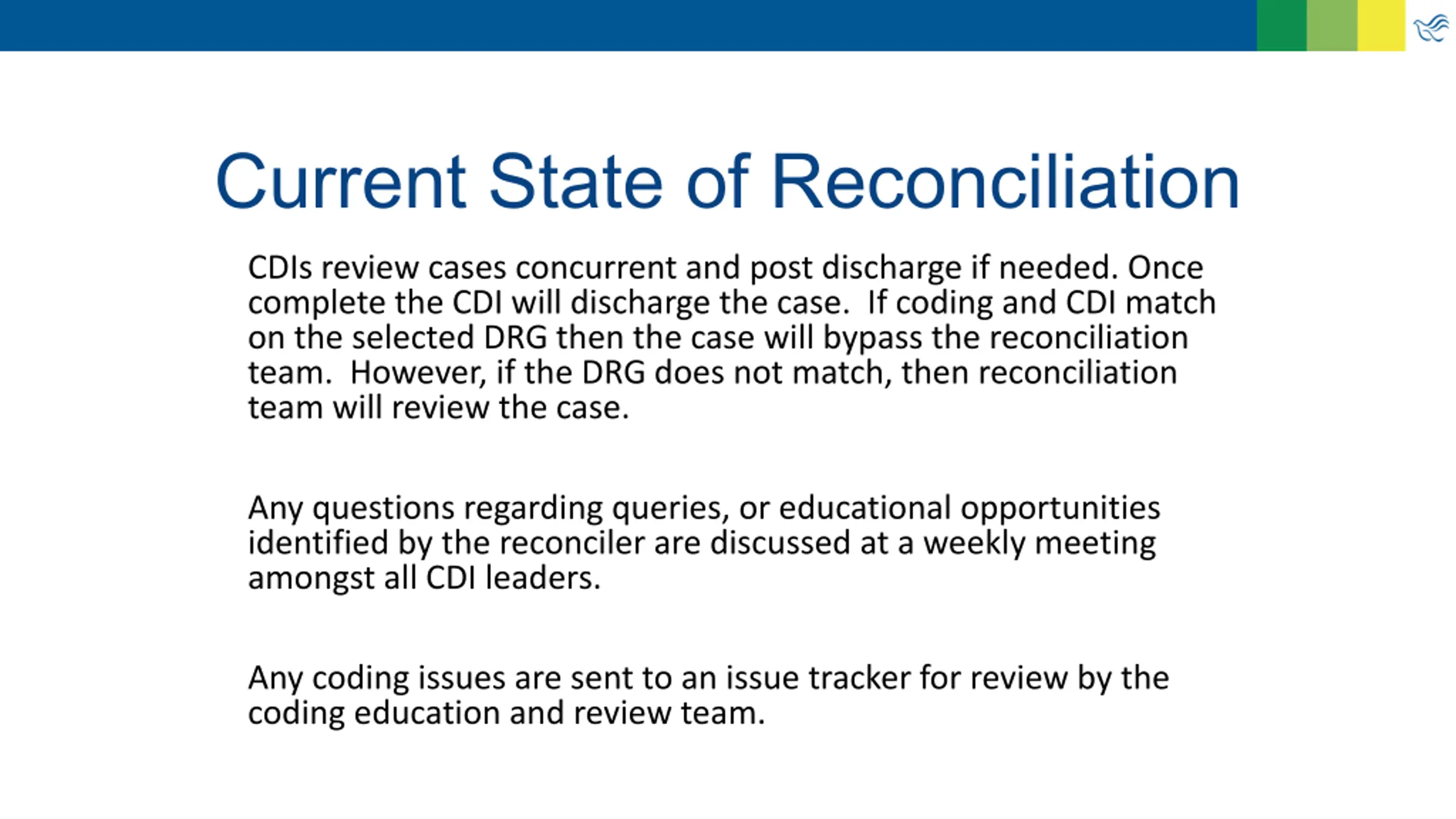 Current State of Reconciliation CDIs review cases concurrent and post discharge if needed. Once complete the CDI will discharge the case. If coding and CDI match on the selected DRG then the case will bypass the reconciliation team. However, if the DRG does not match, then reconciliation team will review the case. Any questions regarding queries, or educational opportunities identified by the reconciler are discussed at a weekly meeting amongst all CDI leaders. Any coding issues are sent to an issue tracker for review by the coding education and review team.
