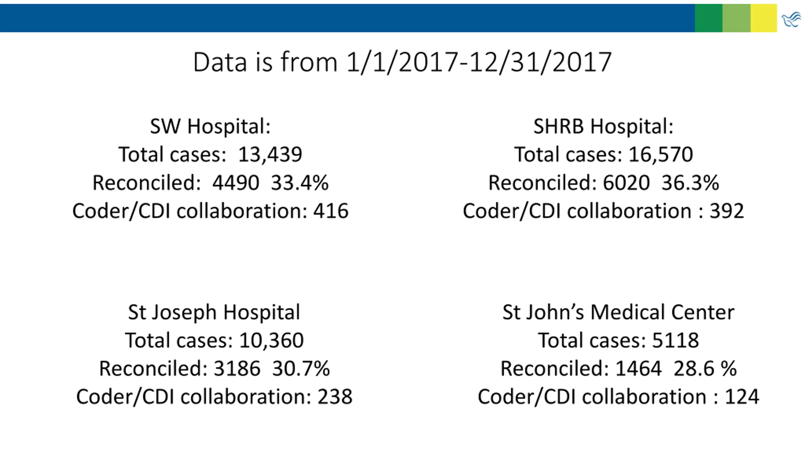 Data is from 1/1/2017-12/31/2017 SW Hospital: Total cases: 13,439 Reconciled: 4490 33.4% Coder/CDI collaboration: 416 SHRB Hospital: Total cases: 16,570 Reconciled: 6020 36.3% Coder/CDI collaboration : 392 St Joseph Hospital Total cases: 10,360 Reconciled: 3186 30.7% Coder/CDI collaboration: 238 St John s Medical Center Total cases: 5118 Reconciled: 1464 28.6 % Coder/CDI collaboration : 124