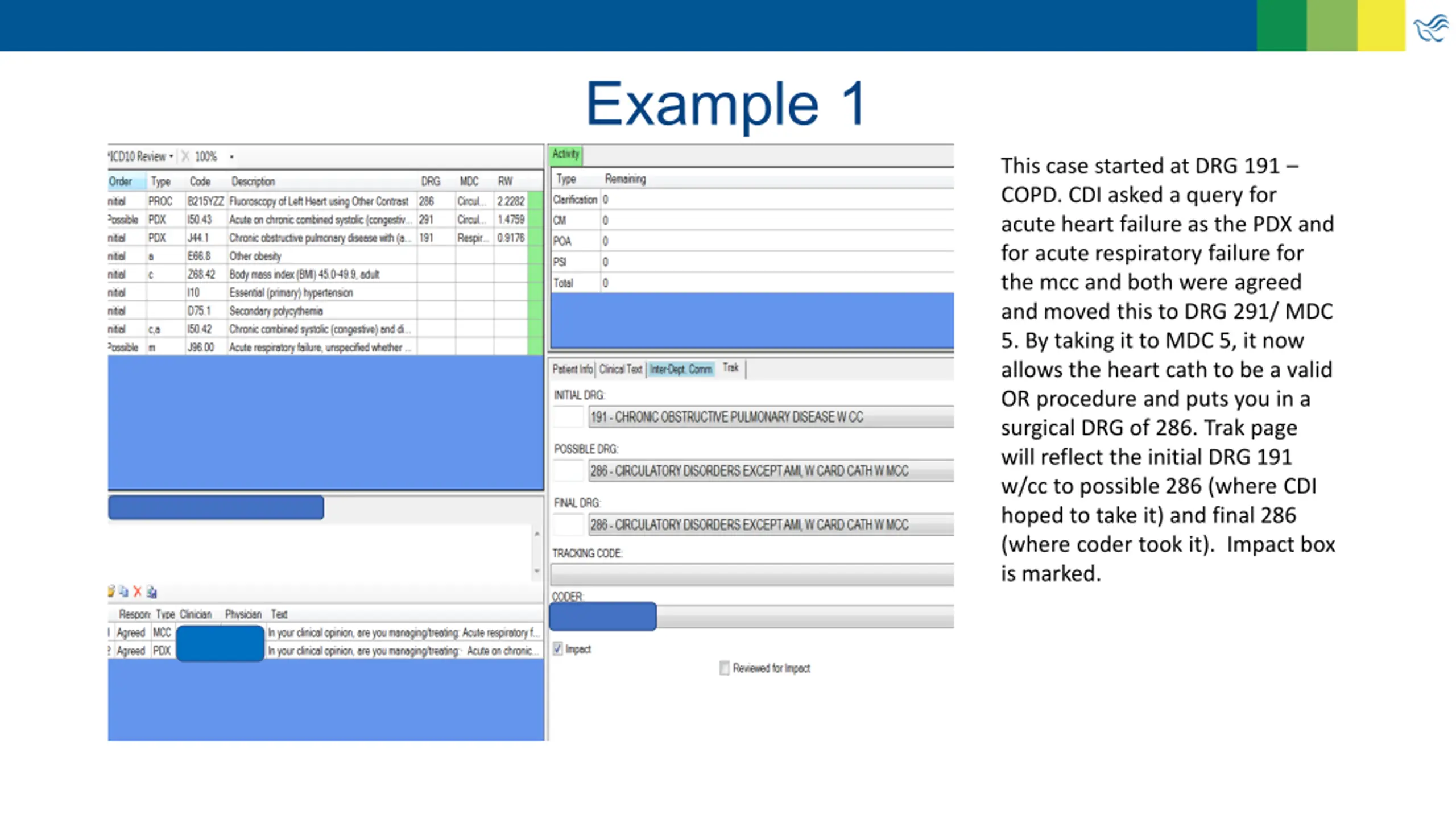 Example 1 This case started at DRG 191 COPD. CDI asked a query for acute heart failure as the PDX and for acute respiratory failure for the mcc and both were agreed and moved this to DRG 291/ MDC 5. By taking it to MDC 5, it now allows the heart cath to be a valid OR procedure and puts you in a surgical DRG of 286. Trak page will reflect the initial DRG 191 w/cc to possible 286 (where CDI hoped to take it) and final 286 (where coder took it). Impact box is marked.