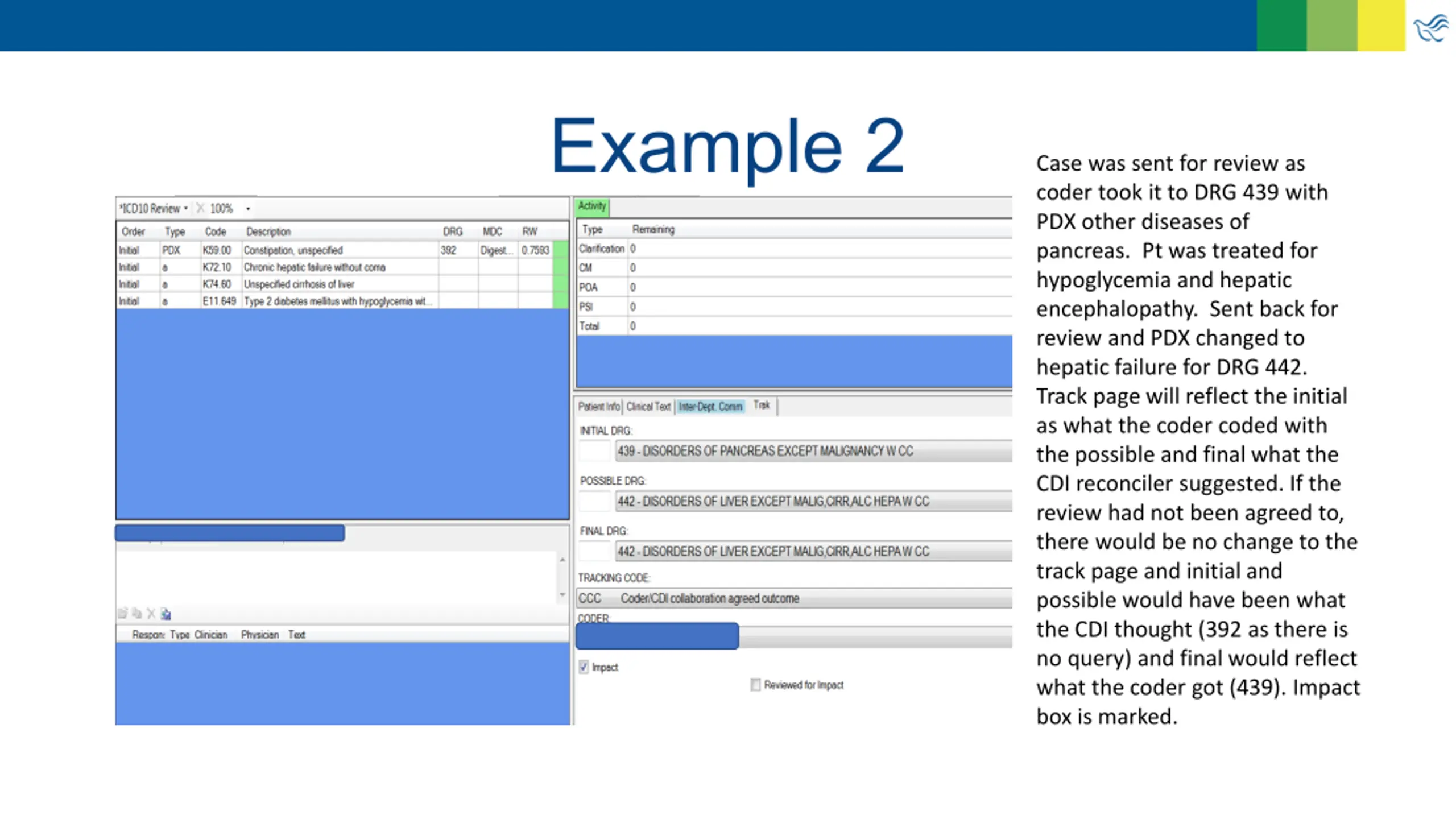 Example 2 Case was sent for review as coder took it to DRG 439 with PDX other diseases of pancreas. Pt was treated for hypoglycemia and hepatic encephalopathy. Sent back for review and PDX changed to hepatic failure for DRG 442. Track page will reflect the initial as what the coder coded with the possible and final what the CDI reconciler suggested. If the review had not been agreed to, there would be no change to the track page and initial and possible would have been what the CDI thought (392 as there is no query) and final would reflect what the coder got (439). Impact box is marked.
