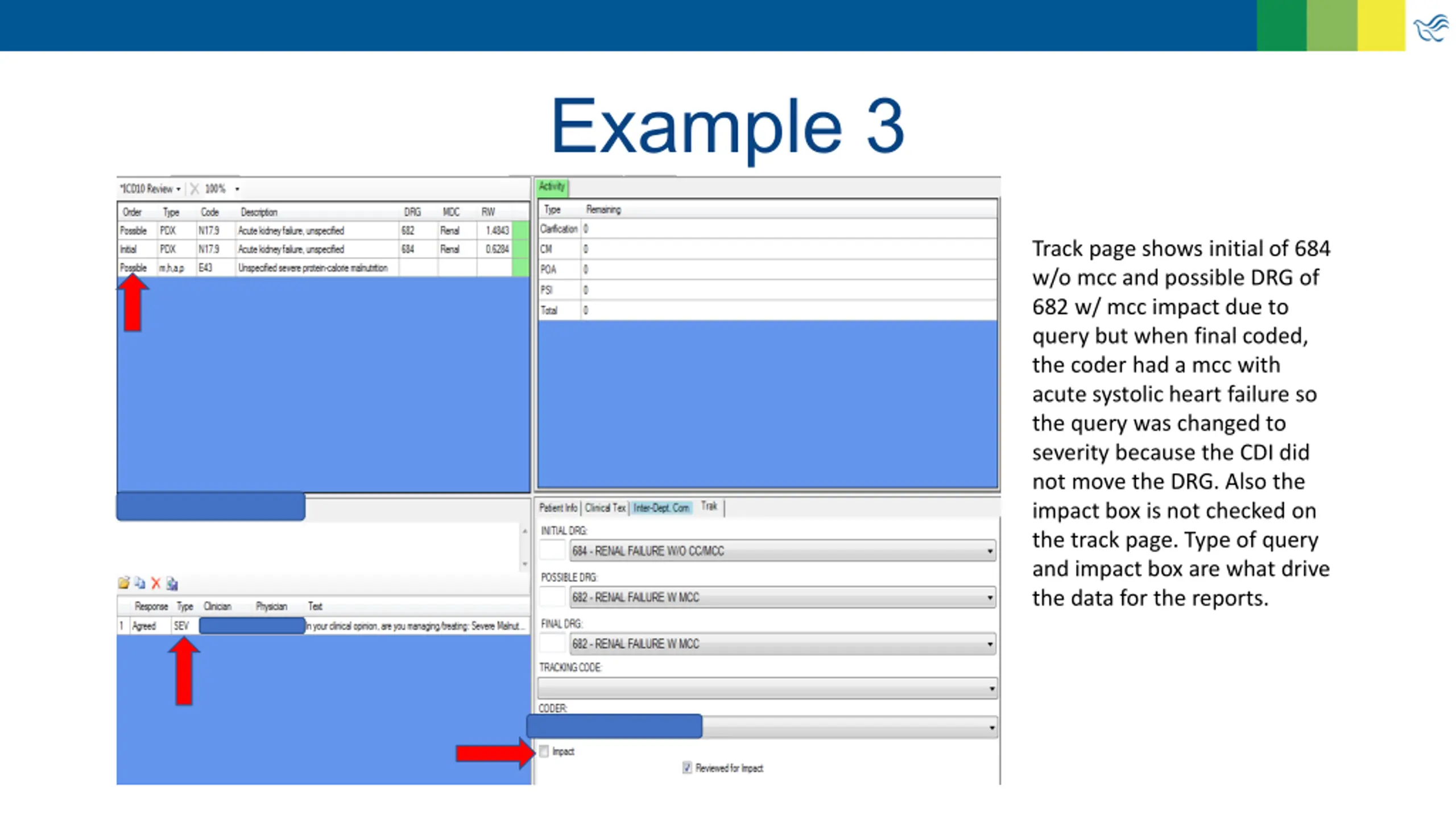 Example 3 Track page shows initial of 684 w/o mcc and possible DRG of 682 w/ mcc impact due to query but when final coded, the coder had a mcc with acute systolic heart failure so the query was changed to severity because the CDI did not move the DRG. Also the impact box is not checked on the track page. Type of query and impact box are what drive the data for the reports.