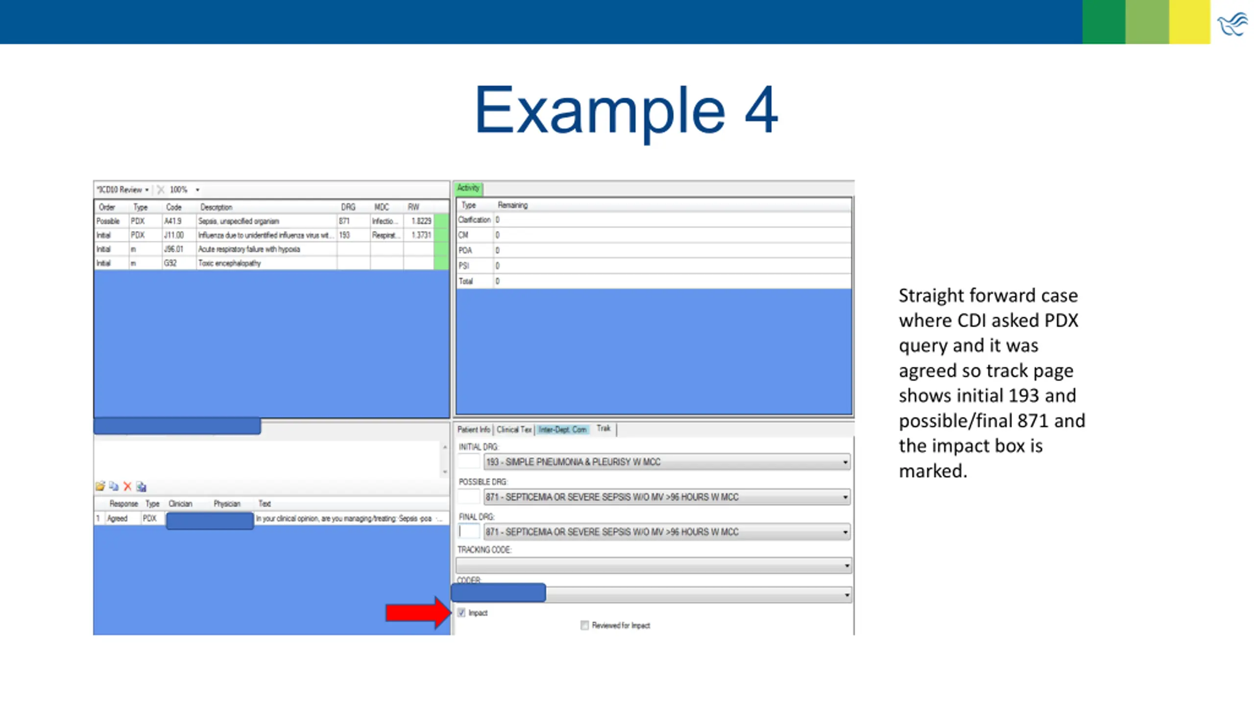 Example 4 Straight forward case where CDI asked PDX query and it was agreed so track page shows initial 193 and possible/final 871 and the impact box is marked.
