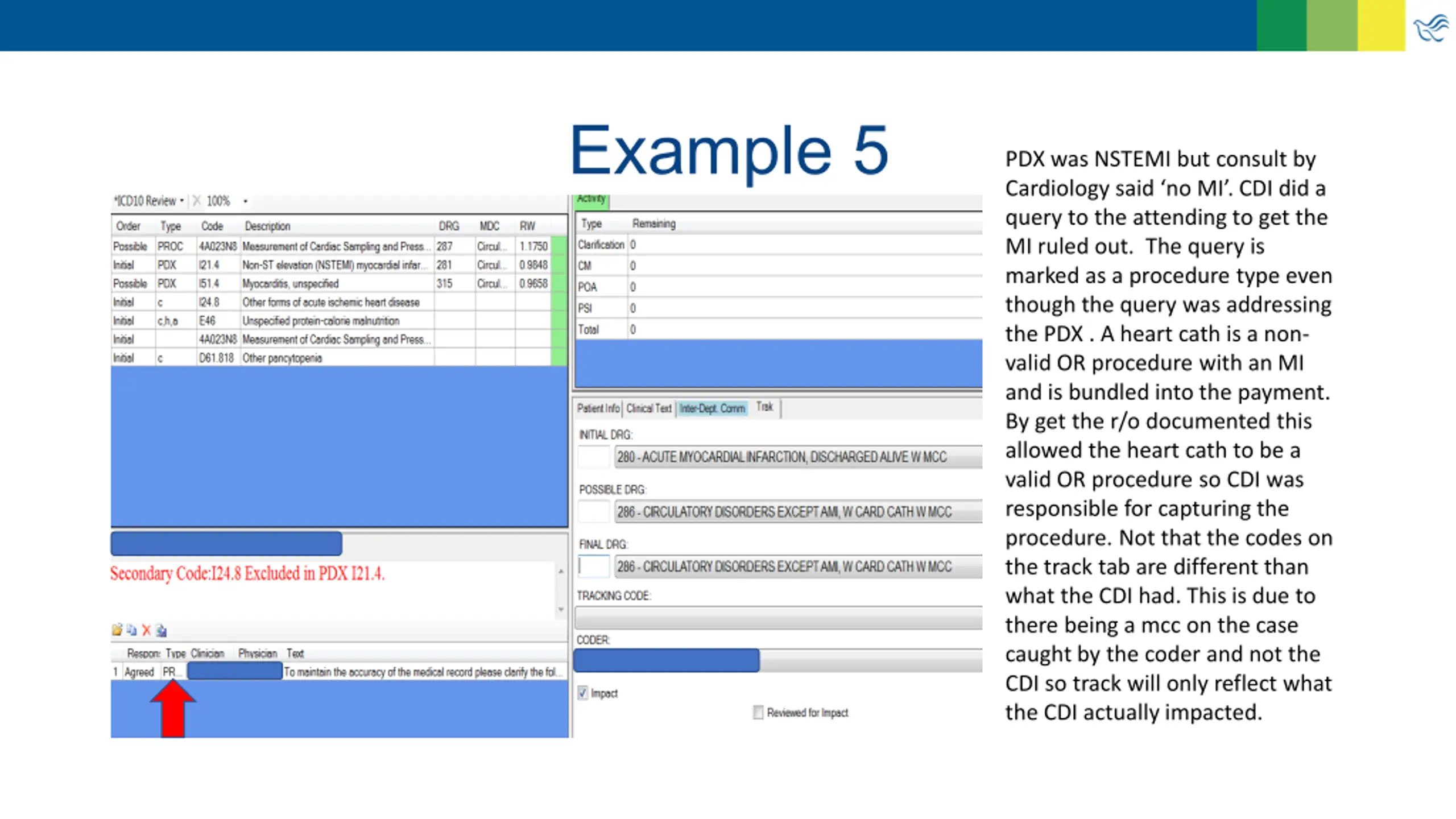 Example 5 PDX was NSTEMI but consult by Cardiology said no MI . CDI did a query to the attending to get the MI ruled out. The query is marked as a procedure type even though the query was addressing the PDX . A heart cath is a non- valid OR procedure with an MI and is bundled into the payment. By get the r/o documented this allowed the heart cath to be a valid OR procedure so CDI was responsible for capturing the procedure. Not that the codes on the track tab are different than what the CDI had. This is due to there being a mcc on the case caught by the coder and not the CDI so track will only reflect what the CDI actually impacted.