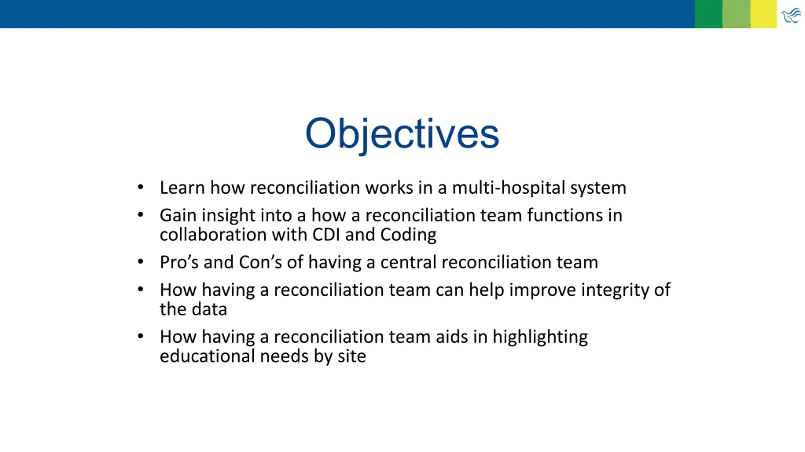 Objectives Learn how reconciliation works in a multi-hospital system Gain insight into a how a reconciliation team functions in collaboration with CDI and Coding Pro s and Con s of having a central reconciliation team How having a reconciliation team can help improve integrity of the data How having a reconciliation team aids in highlighting educational needs by site