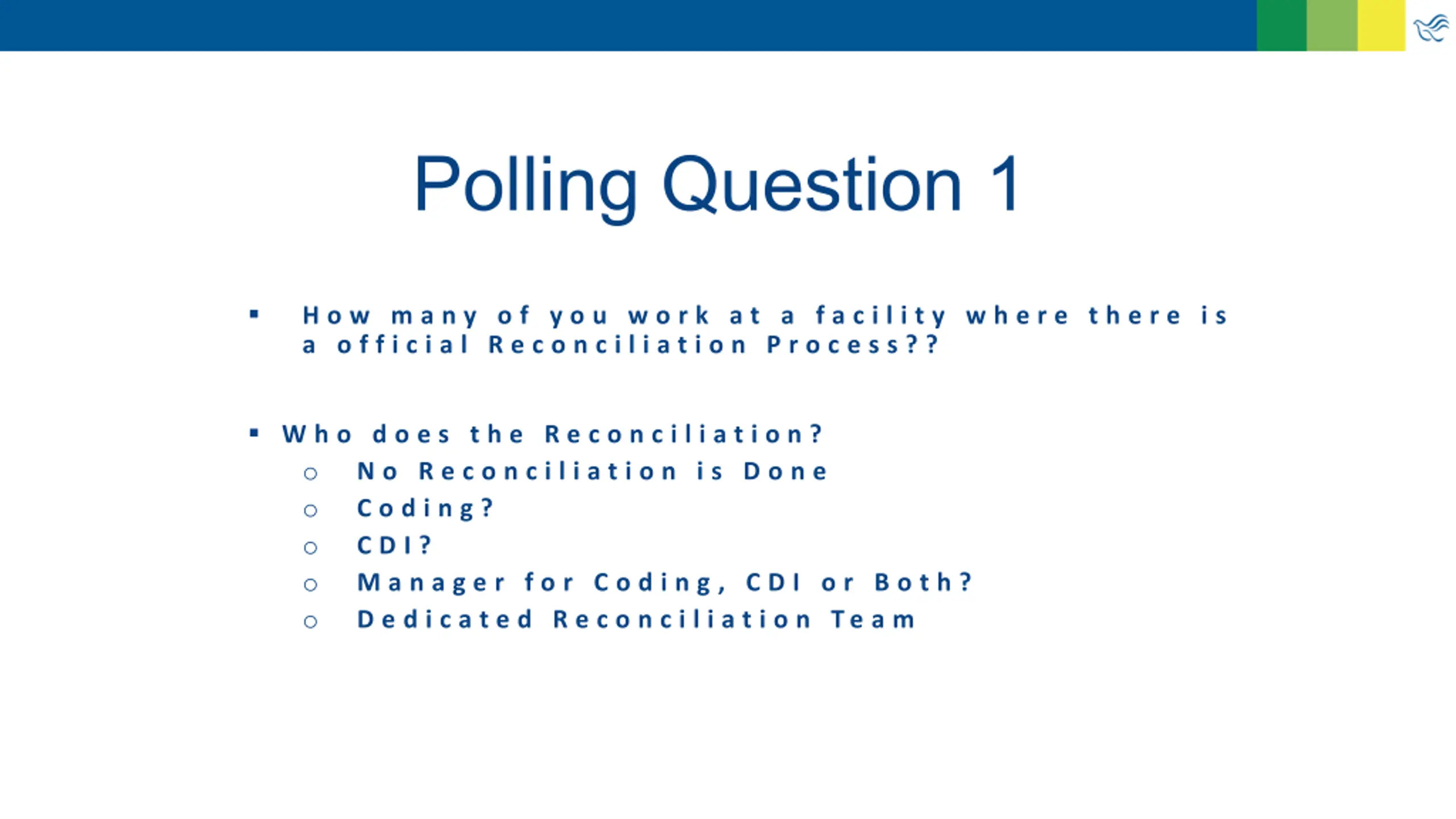 Polling Question 1 H o w m a n y o f y o u w o r k a t a f a c i l i t y w h e r e t h e r e i s a o f f i c i a l R e c o n c i l i a t i o n P r o c e s s ? ? W h o d o e s t h e R e c o n c i l i a t i o n ? o N o R e c o n c i l i a t i o n i s D o n e o C o d i n g ? o C D I ? o M a n a g e r f o r C o d i n g , C D I o r B o t h ? o D e d i c a t e d R e c o n c i l i a t i o n Te a m