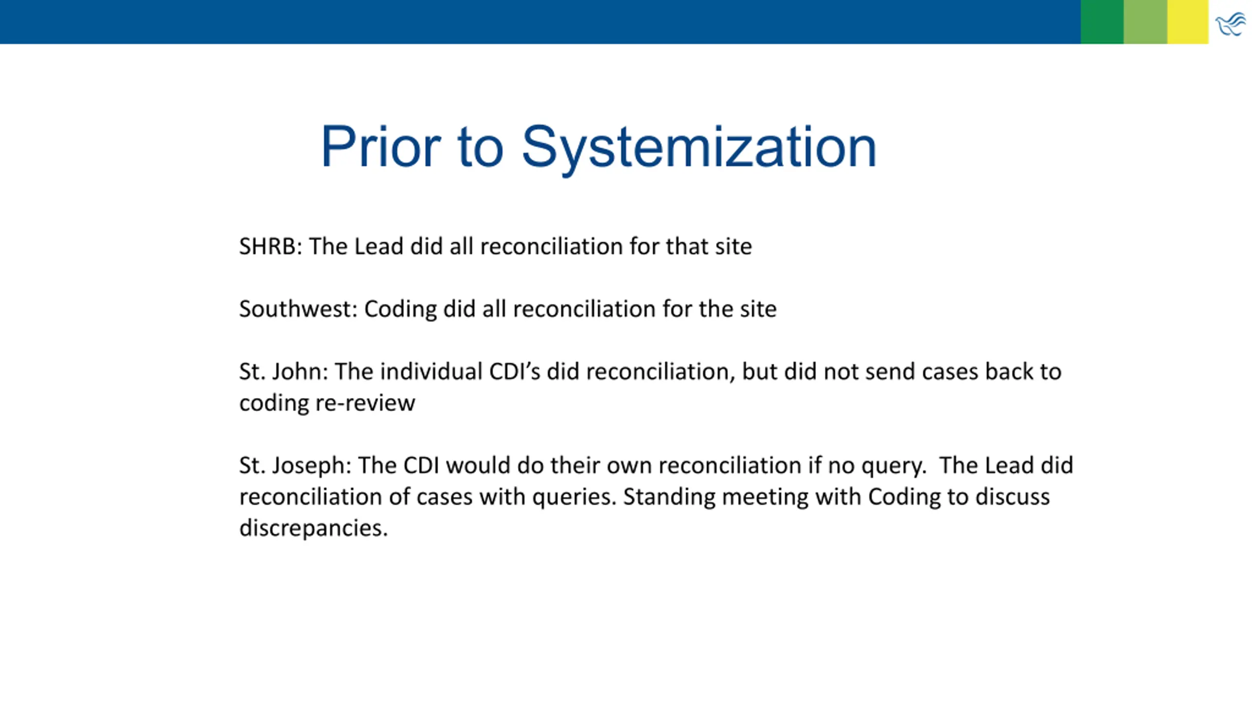 Prior to Systemization SHRB: The Lead did all reconciliation for that site Southwest: Coding did all reconciliation for the site St. John: The individual CDI s did reconciliation, but did not send cases back to coding re-review St. Joseph: The CDI would do their own reconciliation if no query. The Lead did reconciliation of cases with queries. Standing meeting with Coding to discuss discrepancies.