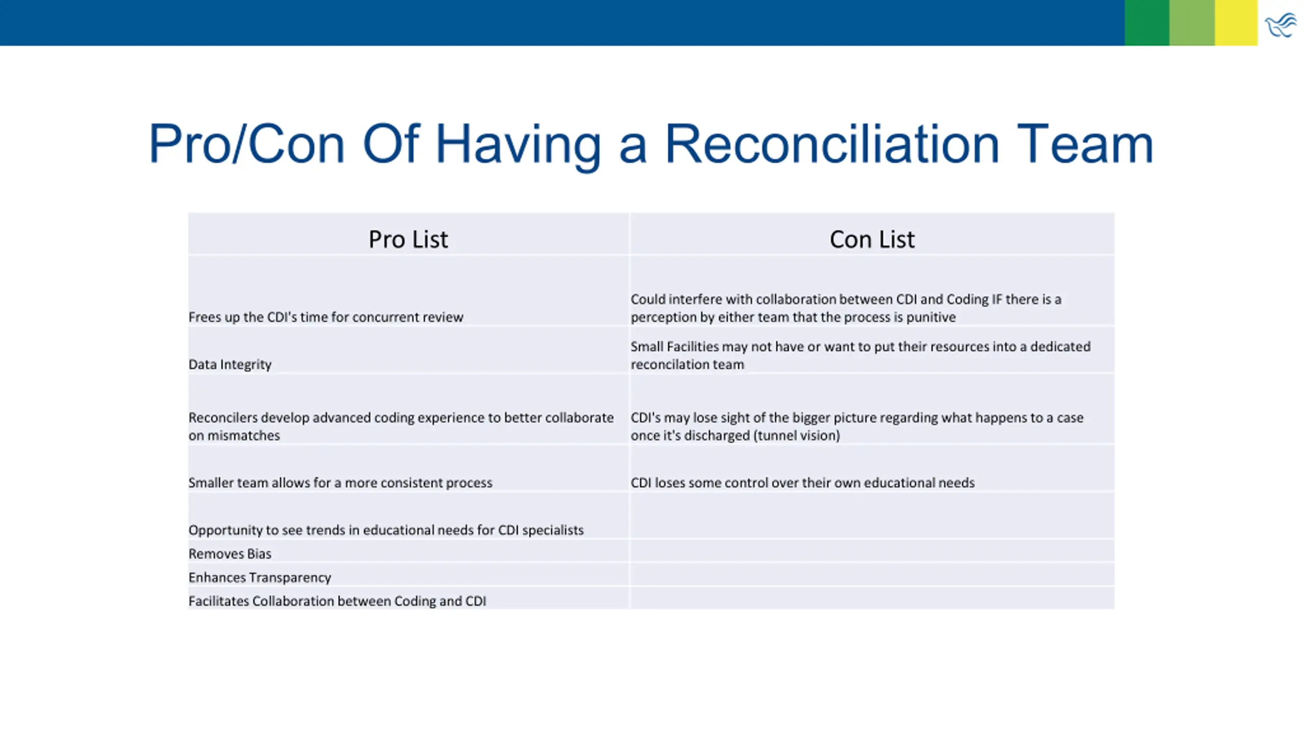 Pro/Con Of Having a Reconciliation Team Pro List Con List Could interfere with collaboration between CDI and Coding IF there is a perception by either team that the process is punitive Frees up the CDI's time for concurrent review Small Facilities may not have or want to put their resources into a dedicated reconcilation team Data Integrity Reconcilers develop advanced coding experience to better collaborate on mismatches CDI's may lose sight of the bigger picture regarding what happens to a case once it's discharged (tunnel vision) Smaller team allows for a more consistent process CDI loses some control over their own educational needs Opportunity to see trends in educational needs for CDI specialists Removes Bias Enhances Transparency Facilitates Collaboration between Coding and CDI