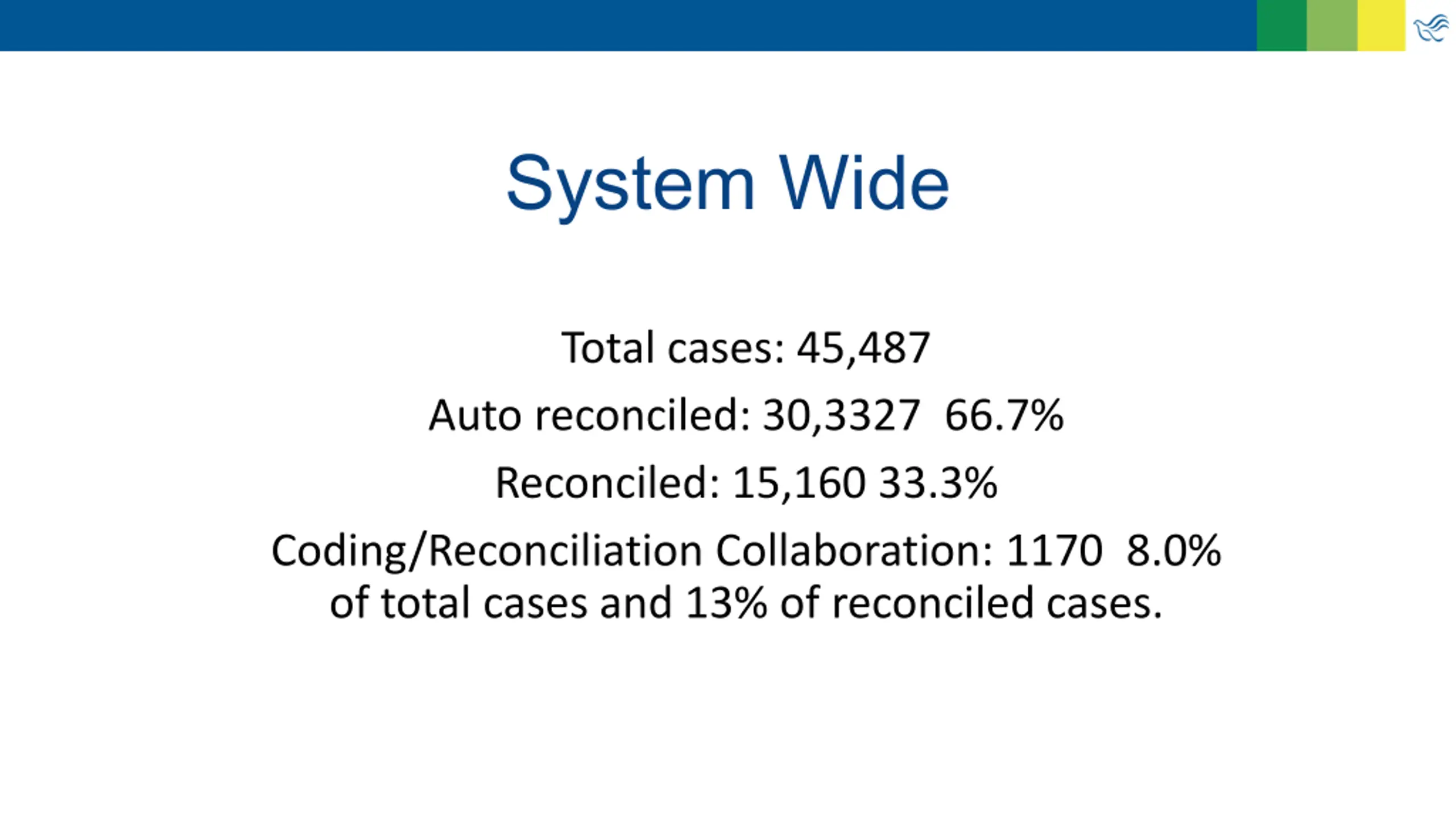 System Wide Total cases: 45,487 Auto reconciled: 30,3327 66.7% Reconciled: 15,160 33.3% Coding/Reconciliation Collaboration: 1170 8.0% of total cases and 13% of reconciled cases.