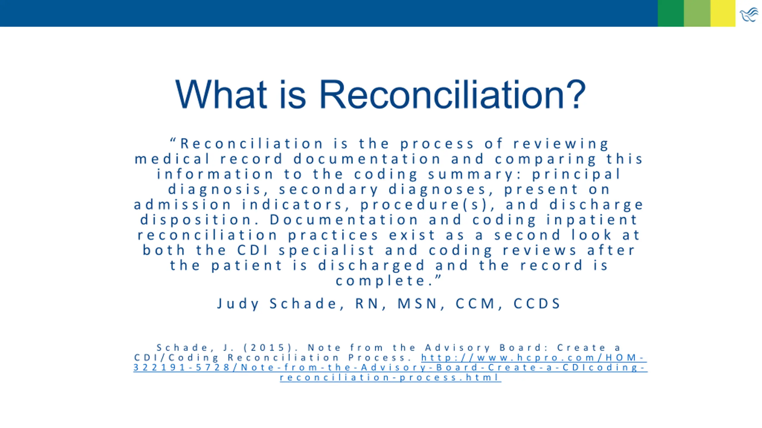 What is Reconciliation? R e c o n c i l i a t i o n i s t h e p r o c e s s o f r e v i e w i n g m e d i c a l r e c o r d d o c u m e n t a t i o n a n d c o m p a r i n g t h i s i n f o r m a t i o n t o t h e c o d i n g s u m m a r y : p r i n c i p a l d i a g n o s i s , s e c o n d a r y d i a g n o s e s , p r e s e n t o n a d m i s s i o n i n d i c a t o r s , p r o c e d u r e ( s ) , a n d d i s c h a r g e d i s p o s i t i o n . D o c u m e n t a t i o n a n d c o d i n g i n p a t i e n t r e c o n c i l i a t i o n p r a c t i c e s e x i s t a s a s e c o n d l o o k a t b o t h t h e C D I s p e c i a l i s t a n d c o d i n g r e v i e w s a f t e r t h e p a t i e n t i s d i s c h a r g e d a n d t h e r e c o r d i s c o m p l e t e . J u d y S c h a d e , R N , M S N , C C M , C C D S S c h a d e , J . ( 2 0 1 5 ) . N o t e f r o m t h e A d v i s o r y B o a r d : C r e a t e a C D I / C o d i n g R e c o n c i l i a t i o n P r o c e s s . h t t p : / / w w w . h c p r o . c o m / H O M - 3 2 2 1 9 1 - 5 7 2 8 / N o t e - f r o m - t h e - A d v i s o r y - B o a r d - C r e a t e - a - C D I c o d i n g - r e c o n c i l i a t i o n - p r o c e s s . h t m l