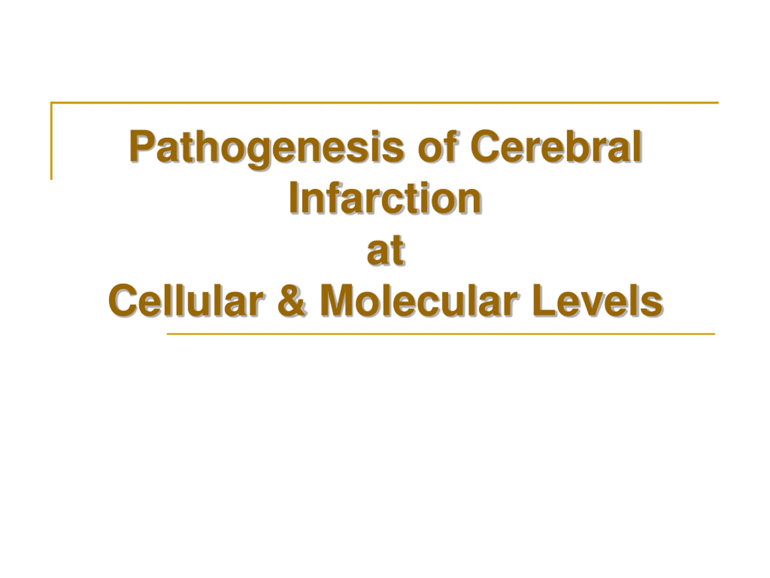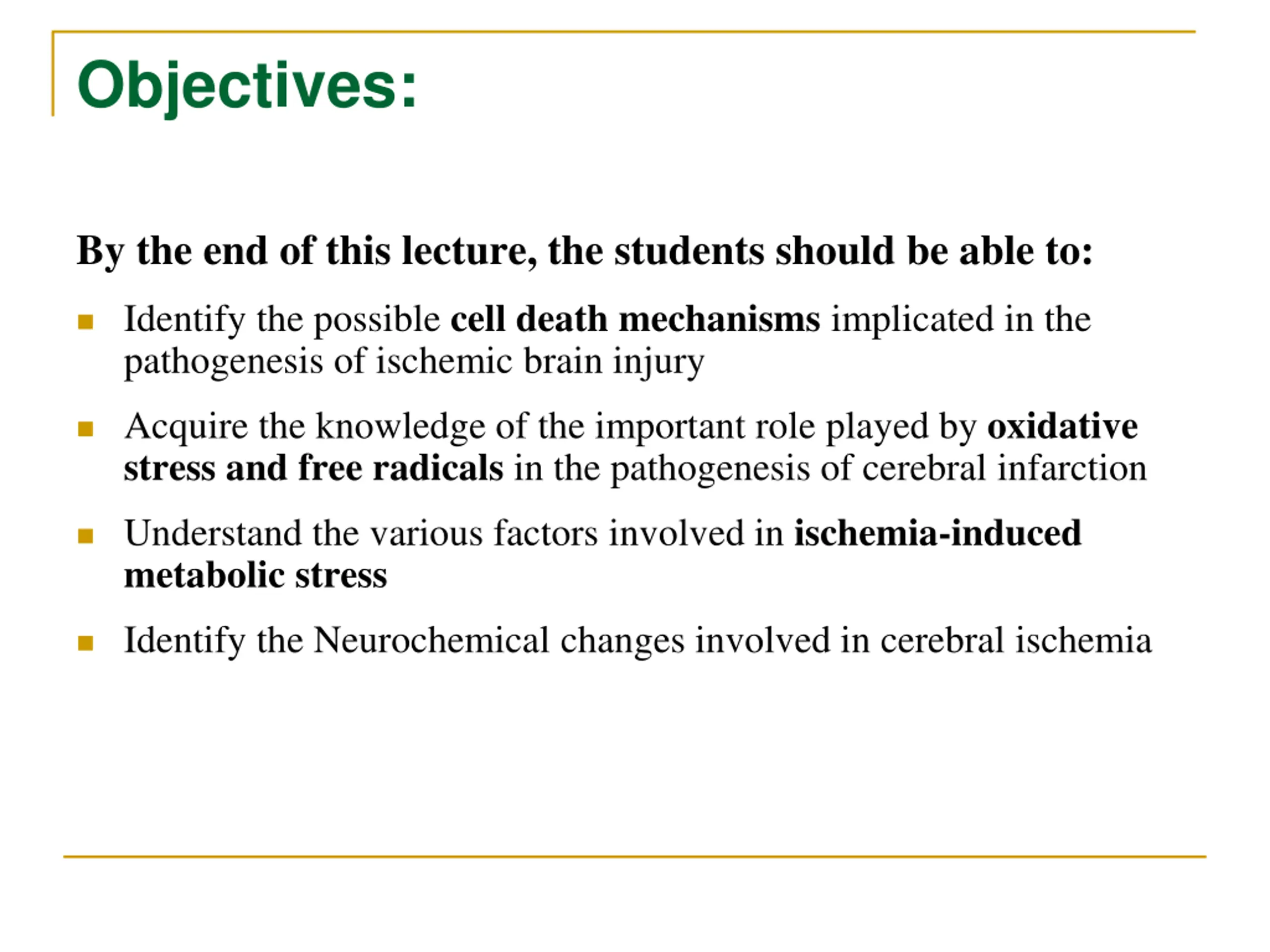 Objectives: By the end of this lecture, the students should be able to: Identify the possible cell death mechanisms implicated in the pathogenesis of ischemic brain injury Acquire the knowledge of the important role played by oxidative stress and free radicals in the pathogenesis of cerebral infarction Understand the various factors involved in ischemia-induced metabolic stress Identify the Neurochemical changes involved in cerebral ischemia