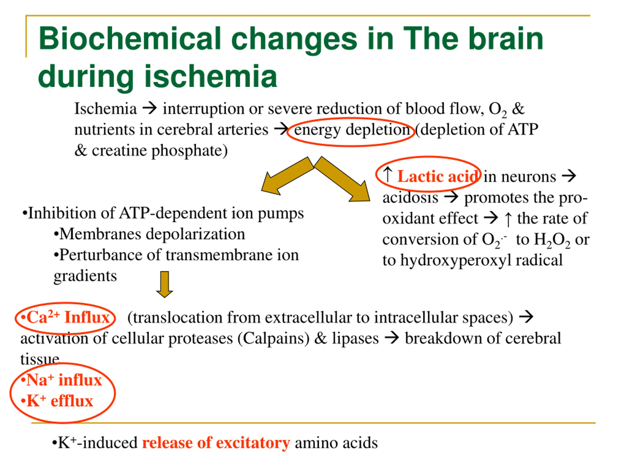 Biochemical changes in The brain during ischemia Ischemia interruption or severe reduction of blood flow, O2& nutrients in cerebral arteries energy depletion (depletion of ATP & creatine phosphate) Lactic acid in neurons acidosis promotes the pro- oxidant effect the rate of conversion of O2.-to H2O2or to hydroxyperoxyl radical Inhibition of ATP-dependent ion pumps Membranes depolarization Perturbance of transmembrane ion gradients Ca2+Influx activation of cellular proteases (Calpains) & lipases breakdown of cerebral tissue Na+influx K+efflux (translocation from extracellular to intracellular spaces) K+-induced release of excitatory amino acids