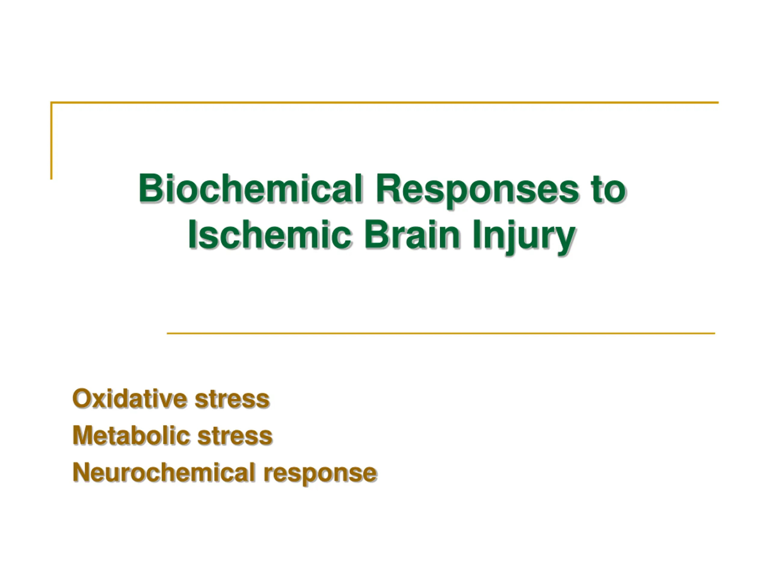 Biochemical Responses to Ischemic Brain Injury Oxidative stress Metabolic stress Neurochemical response