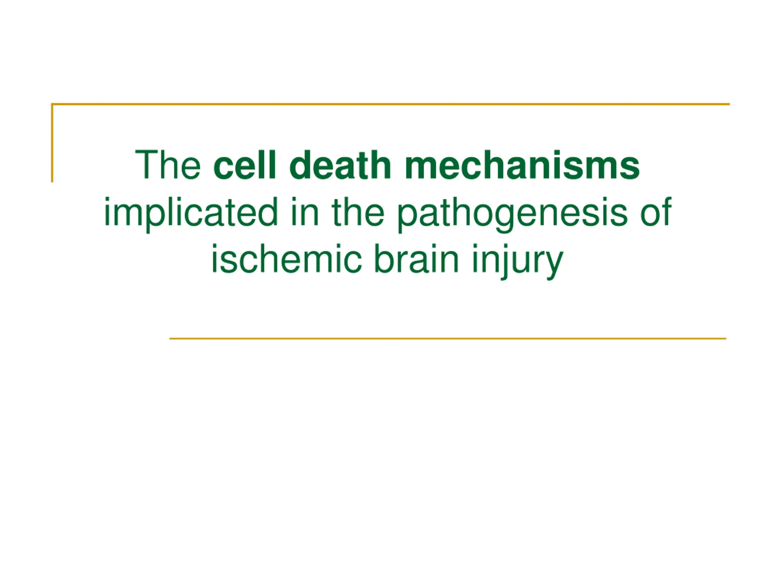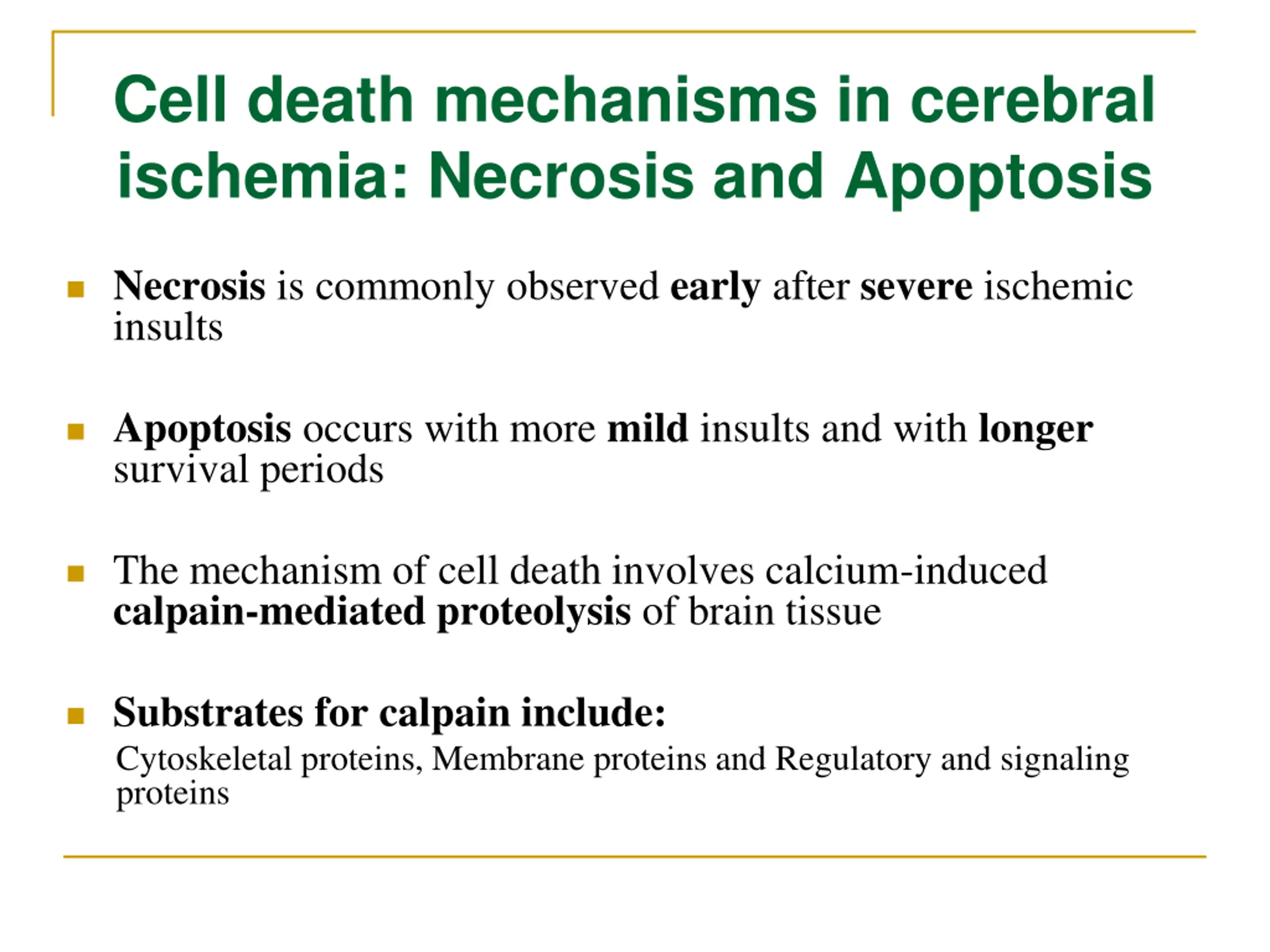Cell death mechanisms in cerebral ischemia: Necrosis and Apoptosis Necrosis is commonly observed early after severe ischemic insults Apoptosis occurs with more mild insults and with longer survival periods The mechanism of cell death involves calcium-induced calpain-mediated proteolysis of brain tissue Substrates for calpain include: Cytoskeletal proteins, Membrane proteins and Regulatory and signaling proteins