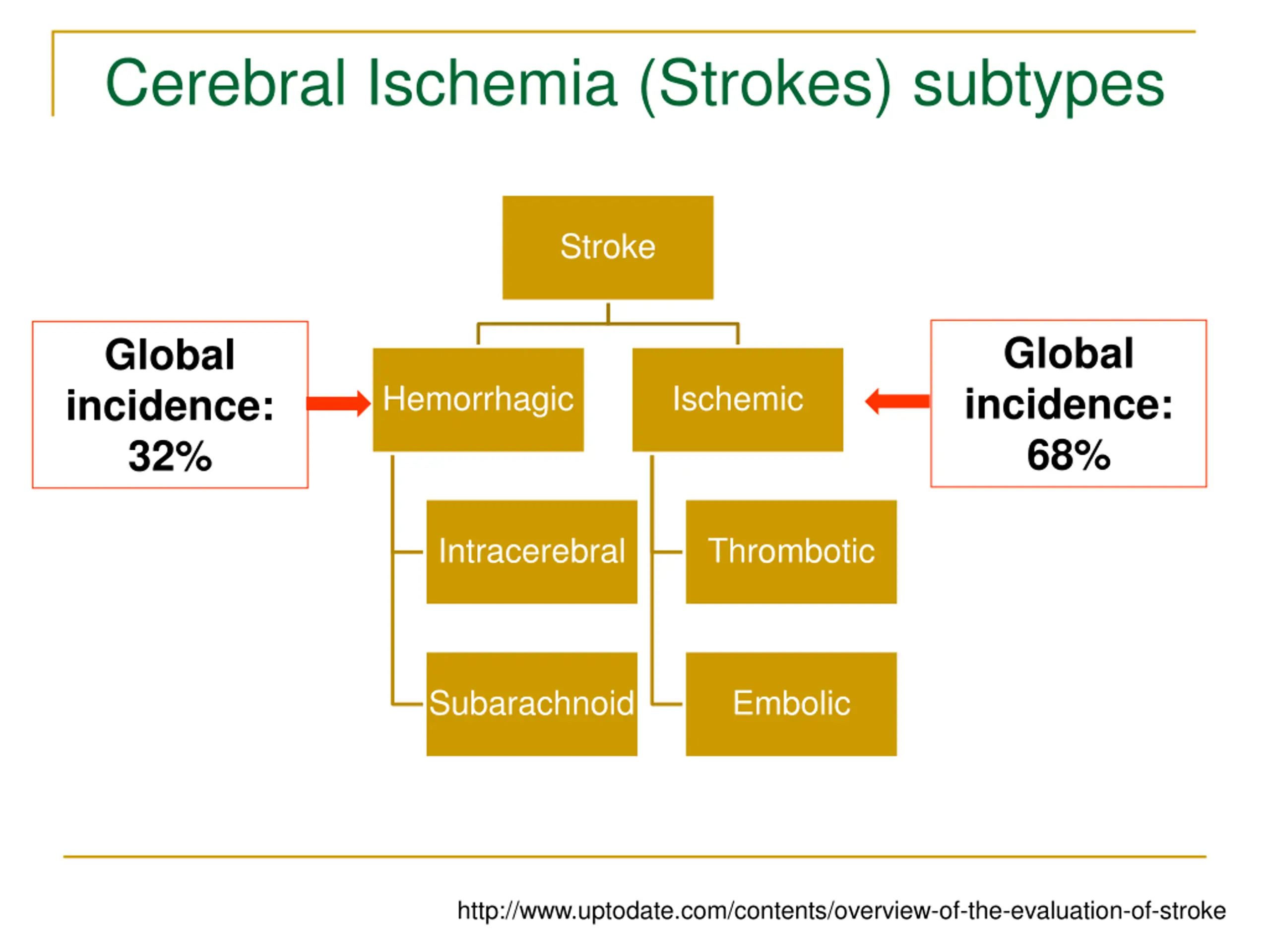 Cerebral Ischemia (Strokes) subtypes Stroke Global incidence: 68% Global incidence: 32% Hemorrhagic Ischemic Intracerebral Thrombotic Subarachnoid Embolic http://www.uptodate.com/contents/overview-of-the-evaluation-of-stroke