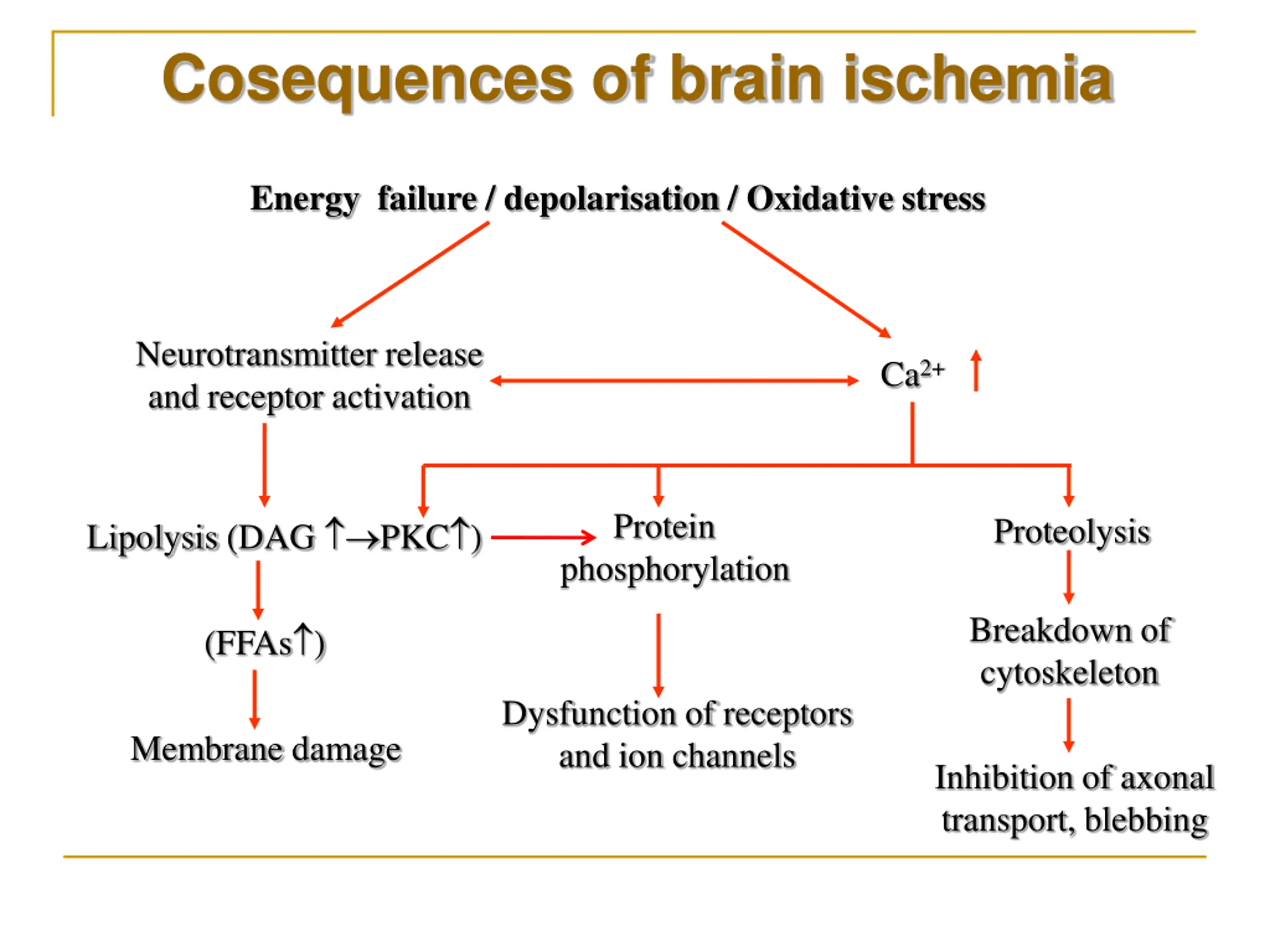 Cosequences of brain ischemia Energy failure / depolarisation / Oxidative stress Neurotransmitter release and receptor activation Ca2+ Protein Proteolysis Lipolysis (DAG PKC ) phosphorylation Breakdown of cytoskeleton (FFAs ) Dysfunction of receptors and ion channels Membrane damage Inhibition of axonal transport, blebbing