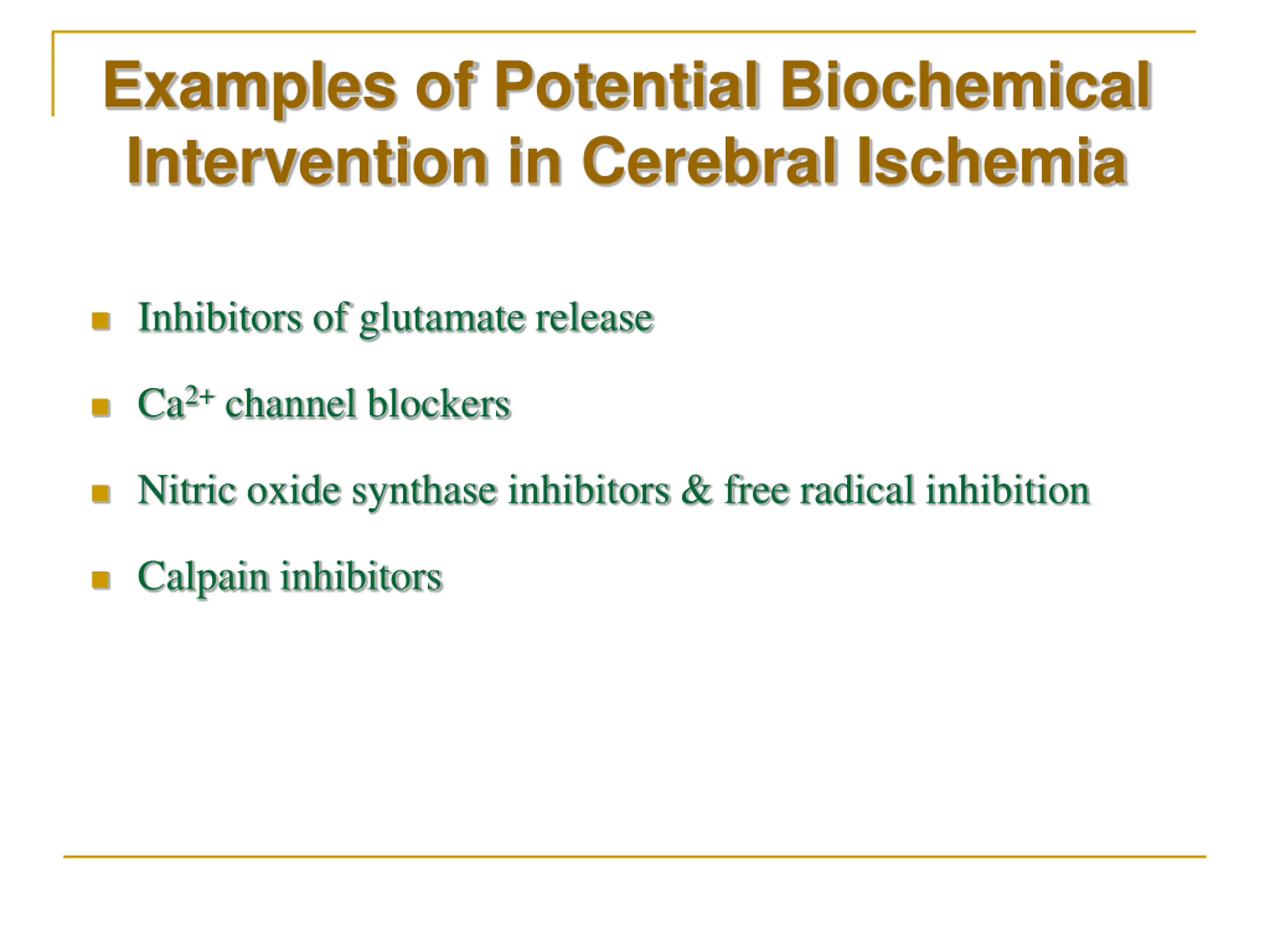 Examples of Potential Biochemical Intervention in Cerebral Ischemia Inhibitors of glutamate release Ca2+channel blockers Nitric oxide synthase inhibitors & free radical inhibition Calpain inhibitors