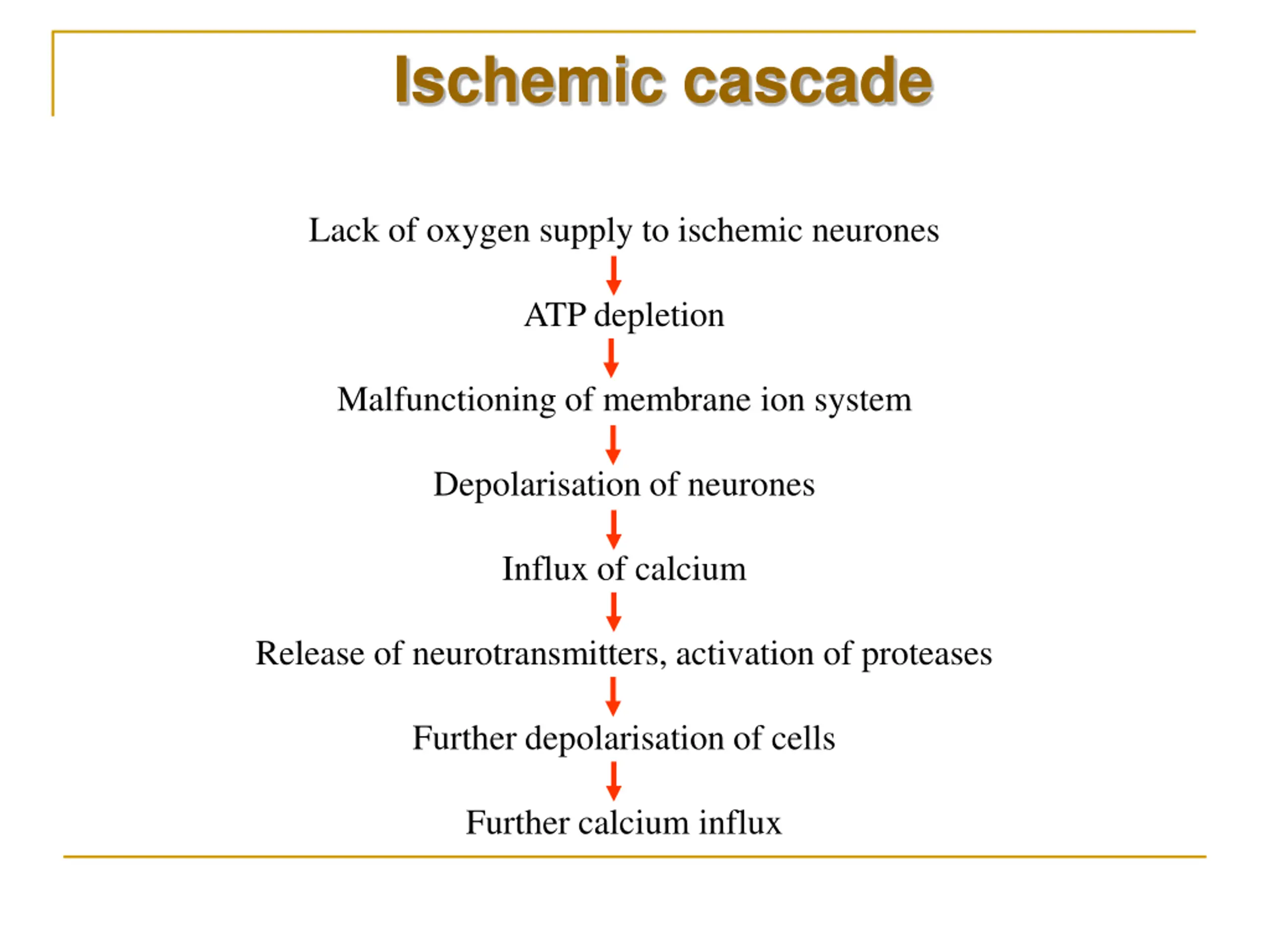 Ischemic cascade Lack of oxygen supply to ischemic neurones ATP depletion Malfunctioning of membrane ion system Depolarisation of neurones Influx of calcium Release of neurotransmitters, activation of proteases Further depolarisation of cells Further calcium influx