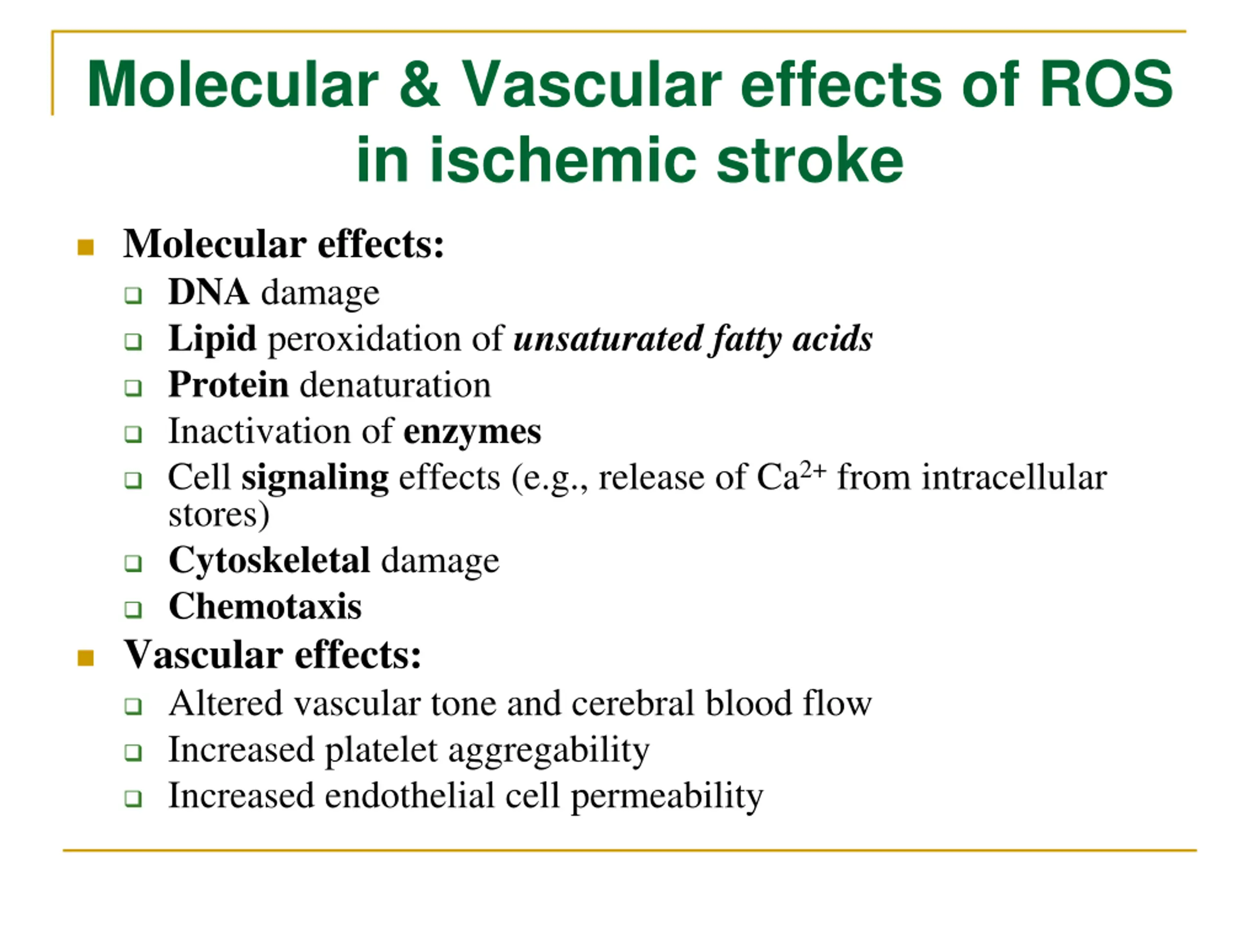Molecular & Vascular effects of ROS in ischemic stroke Molecular effects: DNA damage Lipid peroxidation of unsaturated fatty acids Protein denaturation Inactivation of enzymes Cell signaling effects (e.g., release of Ca2+from intracellular stores) Cytoskeletal damage Chemotaxis Vascular effects: Altered vascular tone and cerebral blood flow Increased platelet aggregability Increased endothelial cell permeability