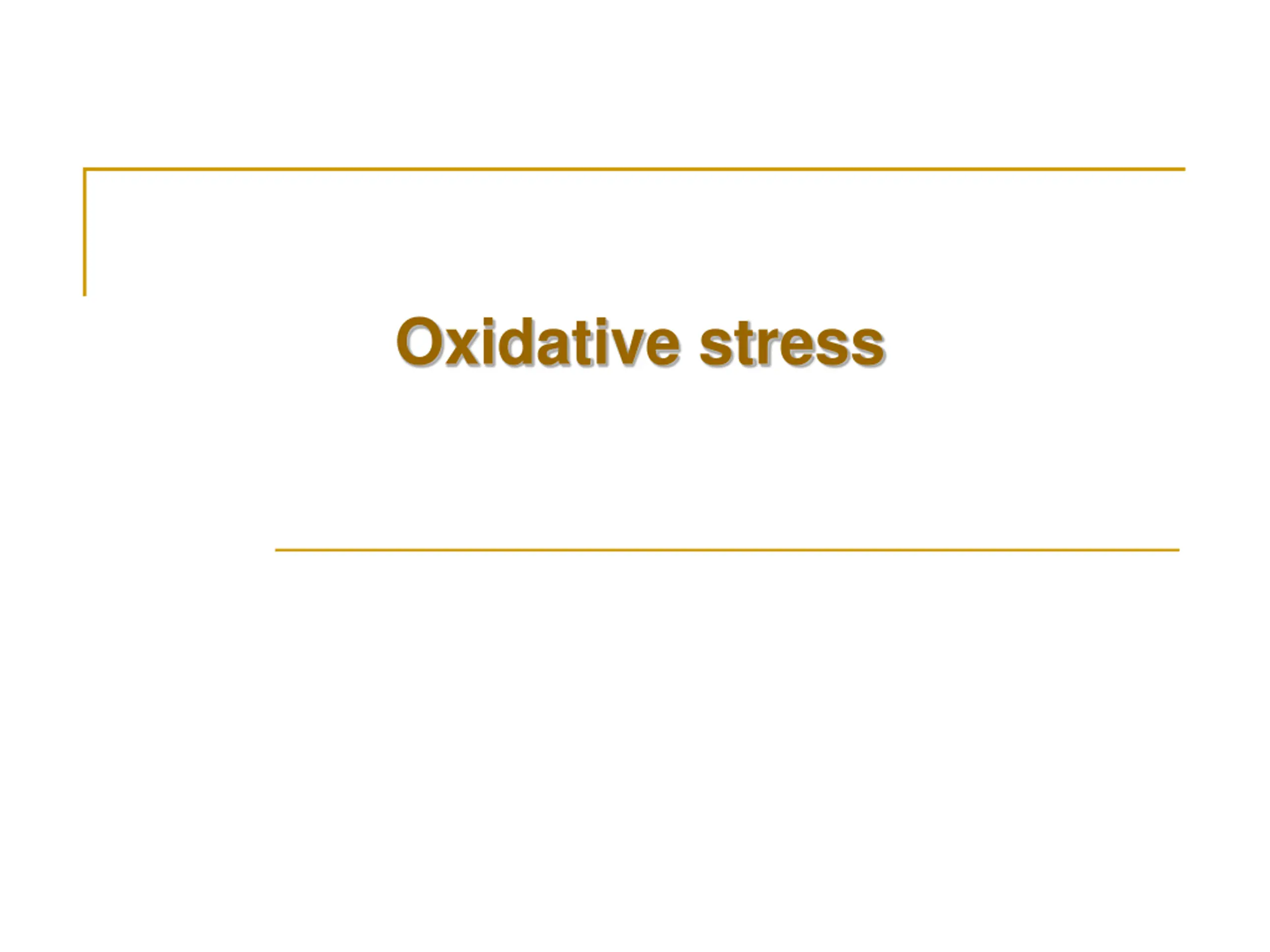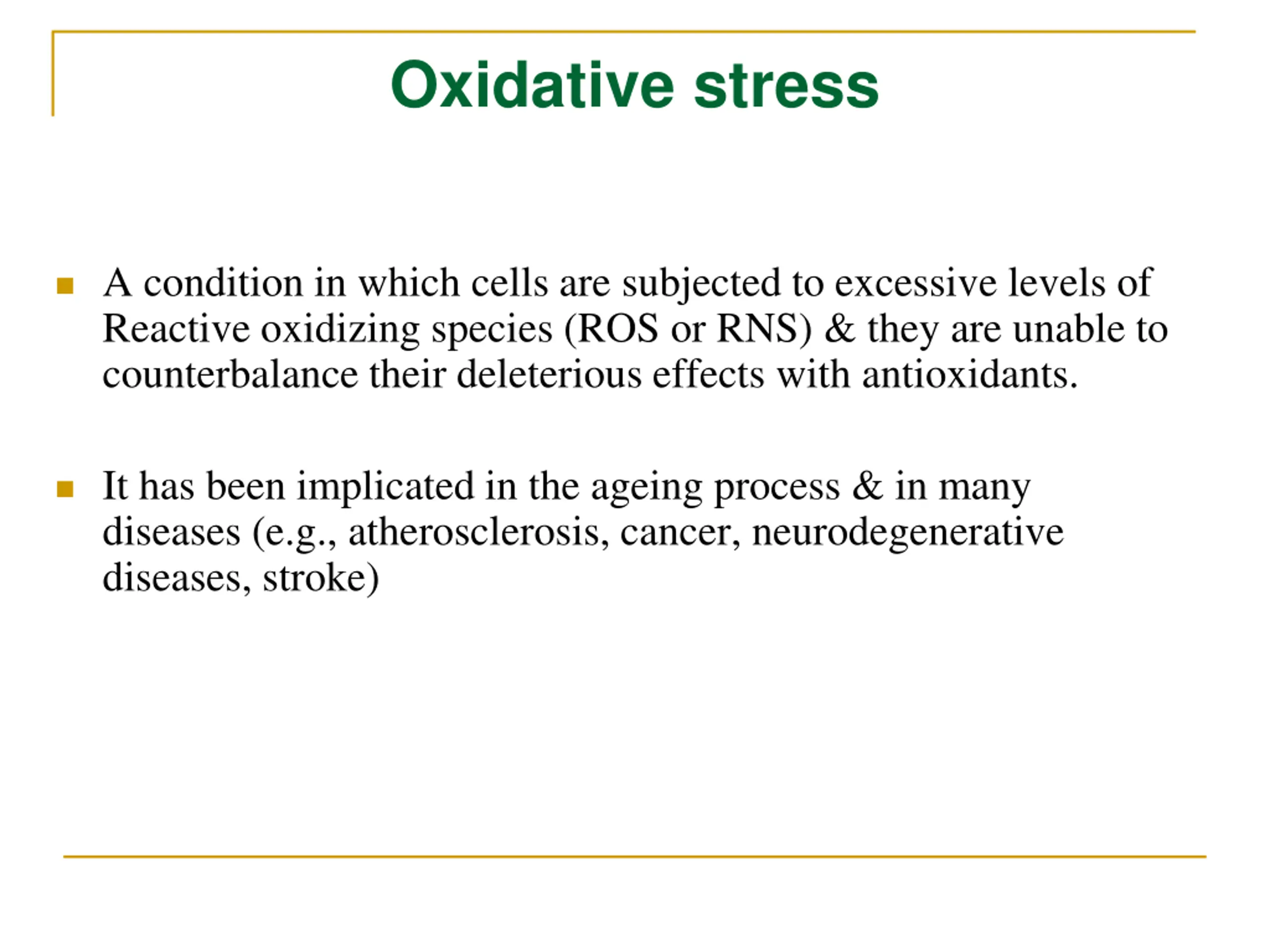 Oxidative stress A condition in which cells are subjected to excessive levels of Reactive oxidizing species (ROS or RNS) & they are unable to counterbalance their deleterious effects with antioxidants. It has been implicated in the ageing process & in many diseases (e.g., atherosclerosis, cancer, neurodegenerative diseases, stroke)