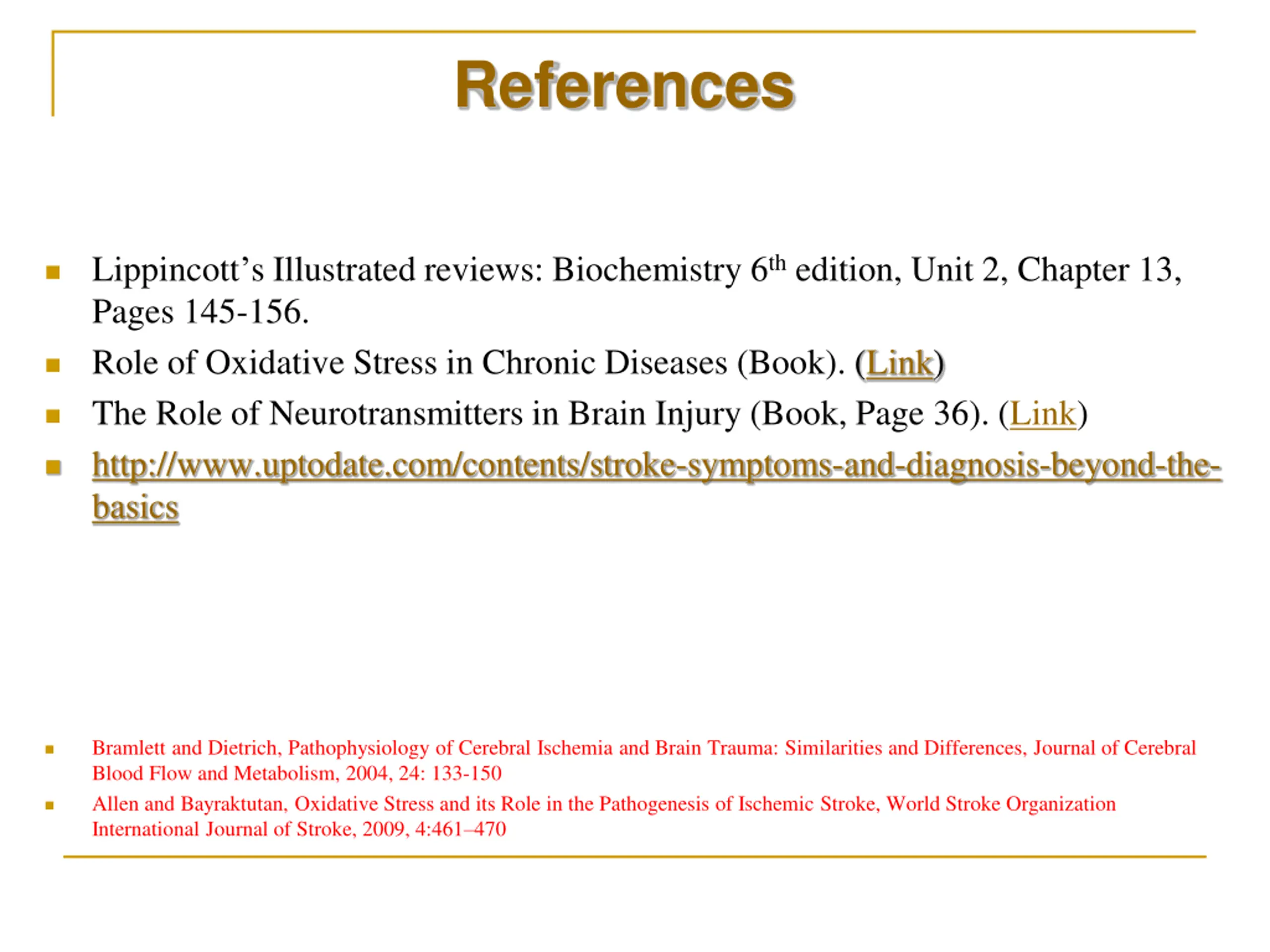 References Lippincott s Illustrated reviews: Biochemistry 6thedition, Unit 2, Chapter 13, Pages 145-156. Role of Oxidative Stress in Chronic Diseases (Book). (Link) The Role of Neurotransmitters in Brain Injury (Book, Page 36). (Link) http://www.uptodate.com/contents/stroke-symptoms-and-diagnosis-beyond-the- basics Bramlett and Dietrich, Pathophysiology of Cerebral Ischemia and Brain Trauma: Similarities and Differences, Journal of Cerebral Blood Flow and Metabolism, 2004, 24: 133-150 Allen and Bayraktutan, Oxidative Stress and its Role in the Pathogenesis of Ischemic Stroke, World Stroke Organization International Journal of Stroke, 2009, 4:461 470