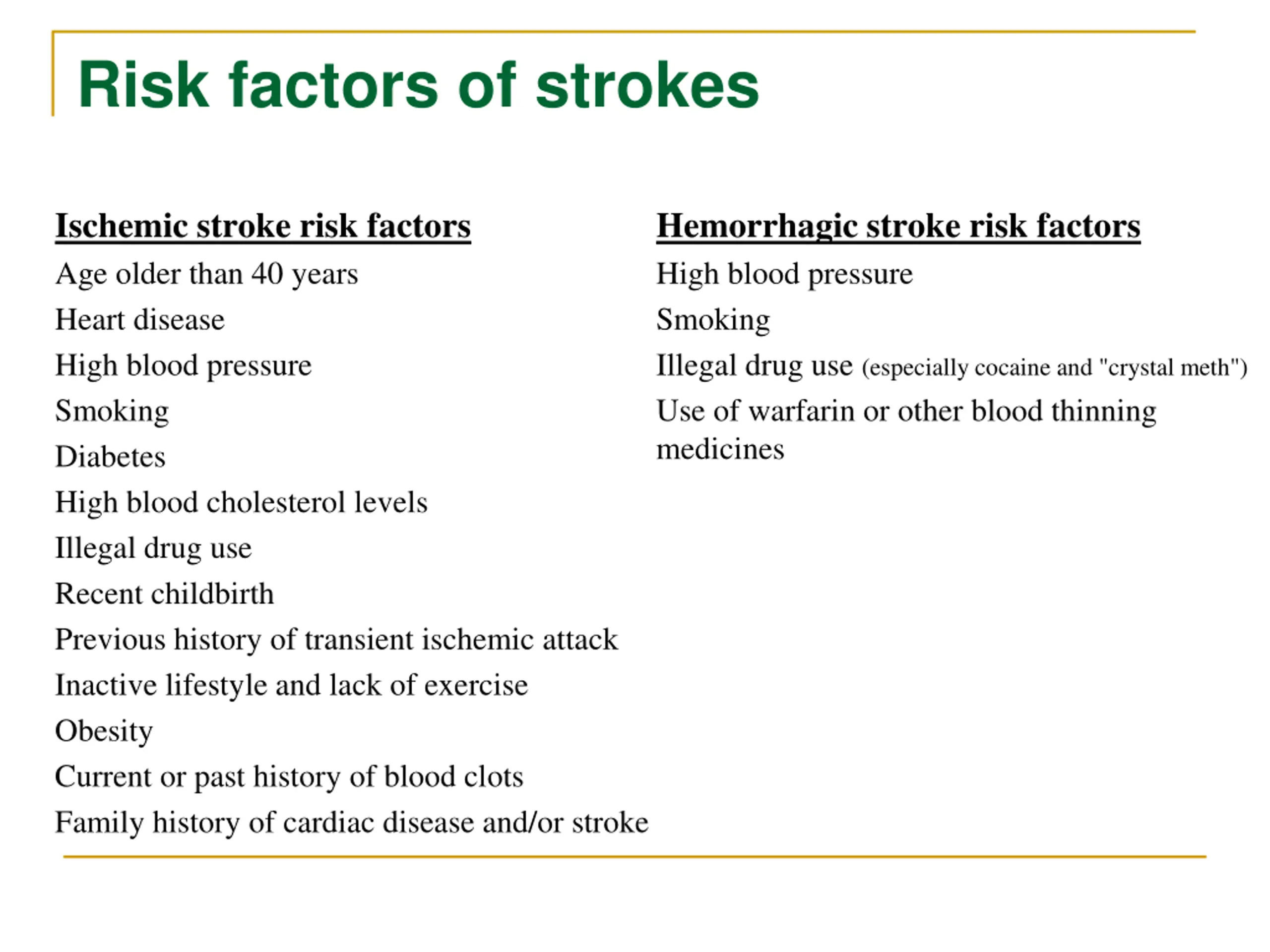 Risk factors of strokes Ischemic stroke risk factors Age older than 40 years Heart disease High blood pressure Smoking Diabetes High blood cholesterol levels Illegal drug use Recent childbirth Previous history of transient ischemic attack Inactive lifestyle and lack of exercise Obesity Current or past history of blood clots Family history of cardiac disease and/or stroke Hemorrhagic stroke risk factors High blood pressure Smoking Illegal drug use (especially cocaine and "crystal meth") Use of warfarin or other blood thinning medicines