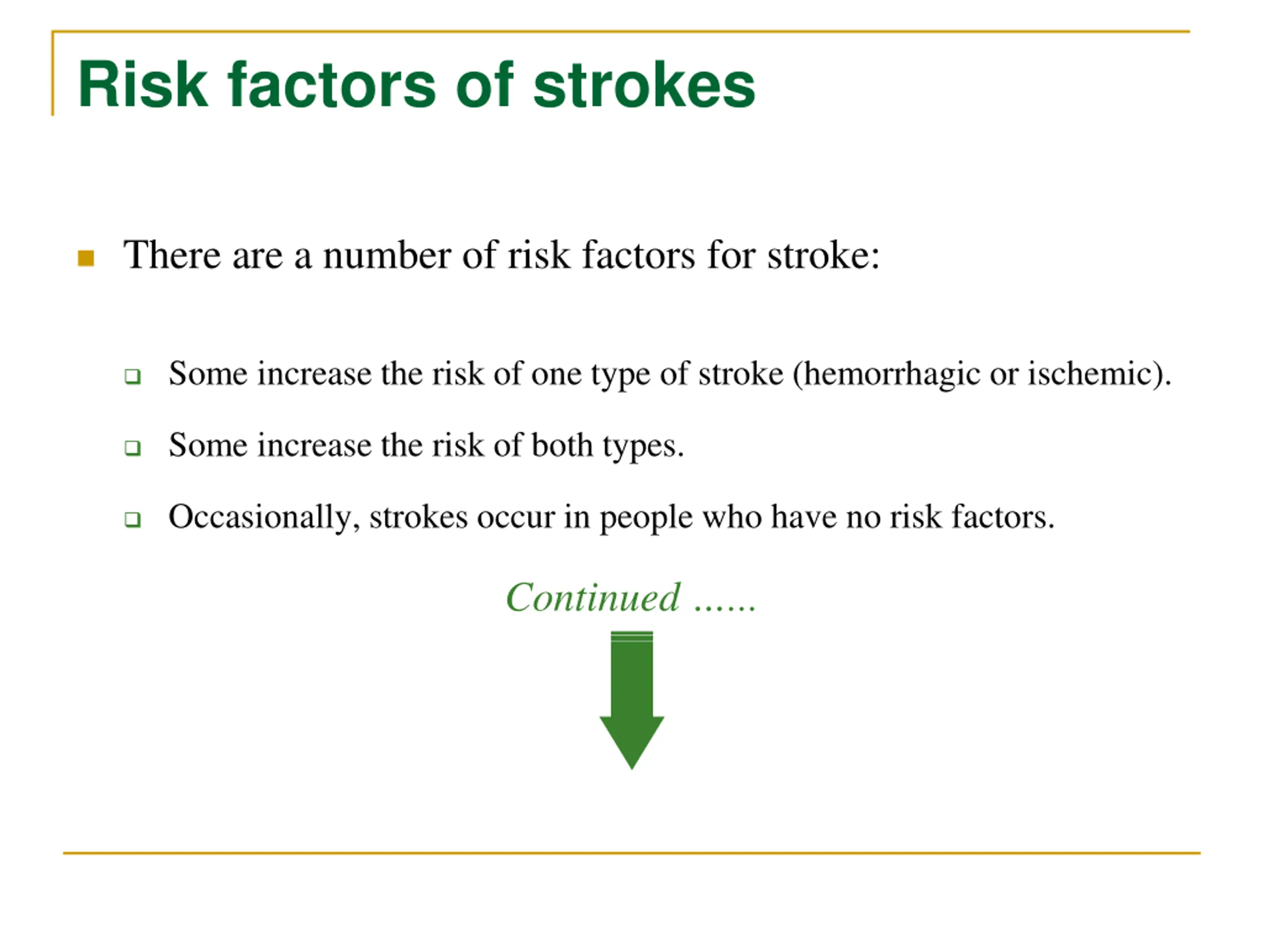 Risk factors of strokes There are a number of risk factors for stroke: Some increase the risk of one type of stroke (hemorrhagic or ischemic). Some increase the risk of both types. Occasionally, strokes occur in people who have no risk factors. Continued ...
